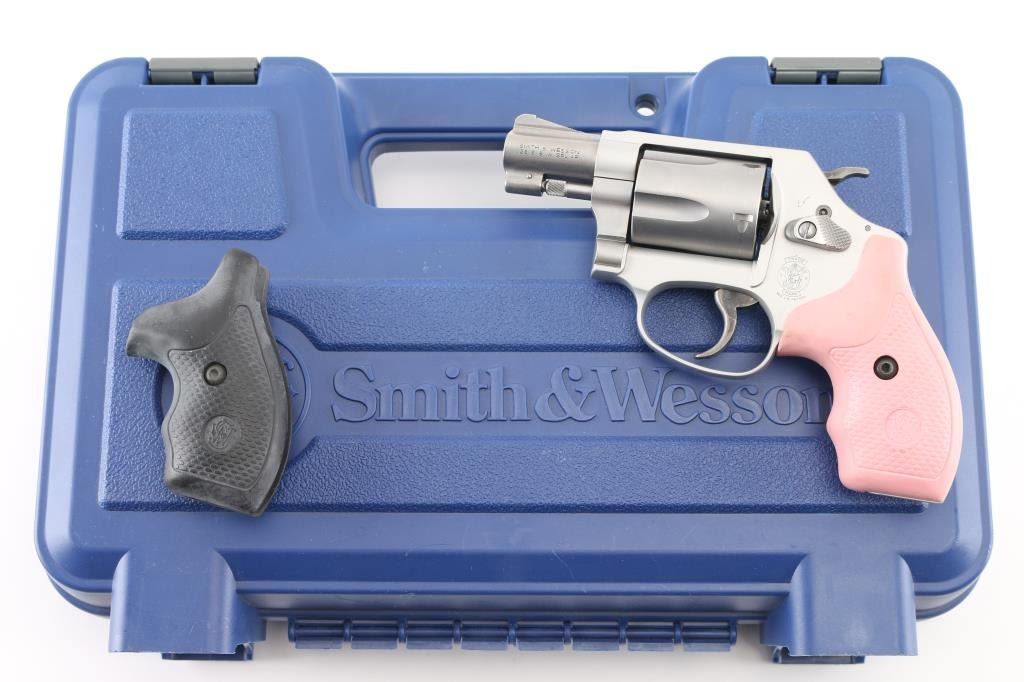 'Airweight' Double action revolver features 1.875" barrel with fixed sights, 5 shot swing out cylinder, internal lock system, "Airweight" frame, pink rubber compact grip. Finish is stainless, with matching color on alloy frame. Bore and chambers are very good condition. Overall condition is excellent, with handling marks, drag line. Includes original factory plastic box with paperwork, two keys for internal locking system, spare set of (black) grips. Condition is NRA Excellent *** Modern Firearm ***