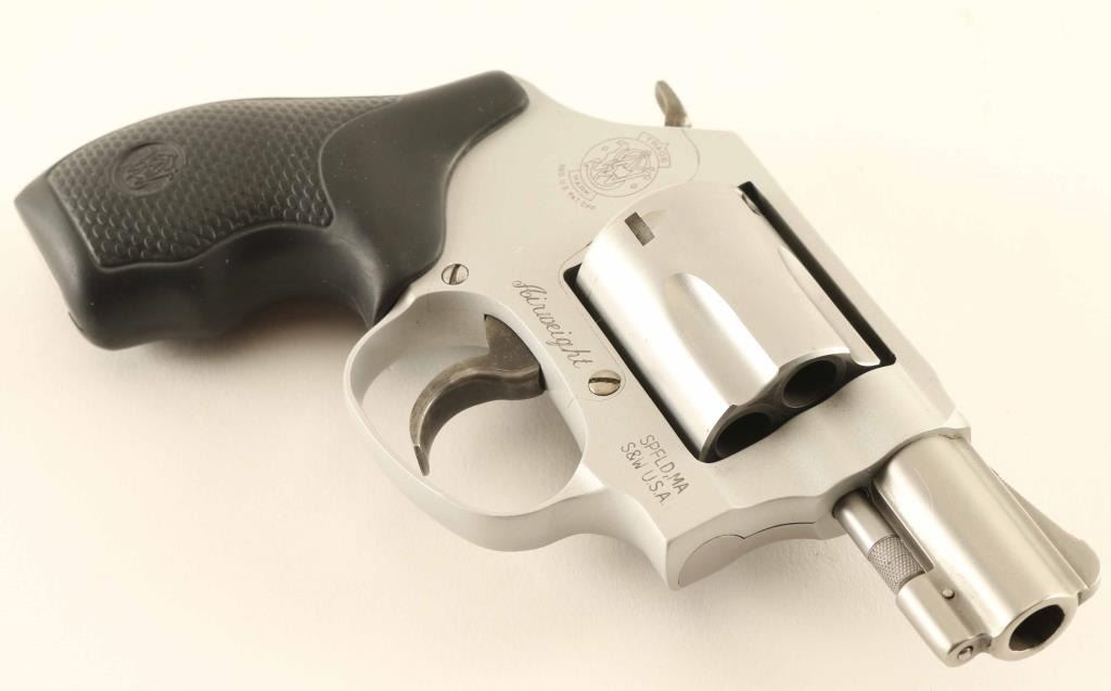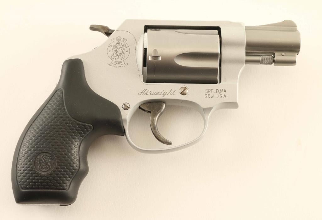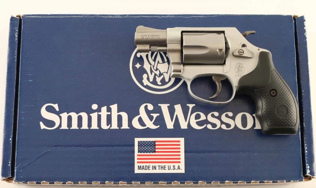 '.38 Chiefs Special Airweight Stainless' Lightweight small frame double action revolver rated for .38 Special +P, manufactured circa 2012. Features a matte stainless/clear anodized fuse alloy finish, 1 7/8" barrel with sighting rib, serrated ramp front sight with red accented patridge tip, square notched rear sight with red accents added, fluted five-shot cylinder, round butt J Magnum frame, internal key lock, smooth .312" smooth trigger, .240" service hammer and one-piece textured black rubber finger groove wrap-around grip with molded S&W insignias. Includes the original one-piece blue cardboard box with documents, spent case, lock, and keys. Revolver exhibits a few small bright scratches on the frame and shows some minor scuffs on the stainless cylinder & barrel. Action is crisp with very good lock-up, the bore is pristine and the rubber grip is fine. Condition is NRA Excellent in box. ***Modern Firearm***