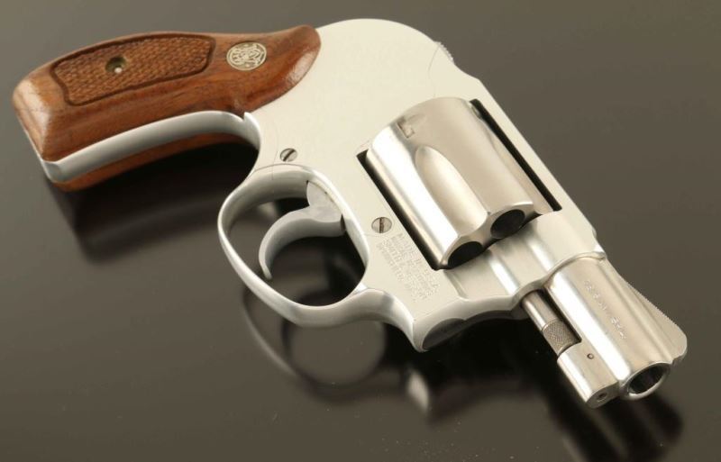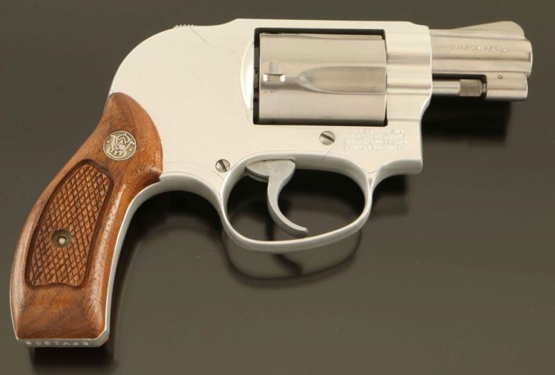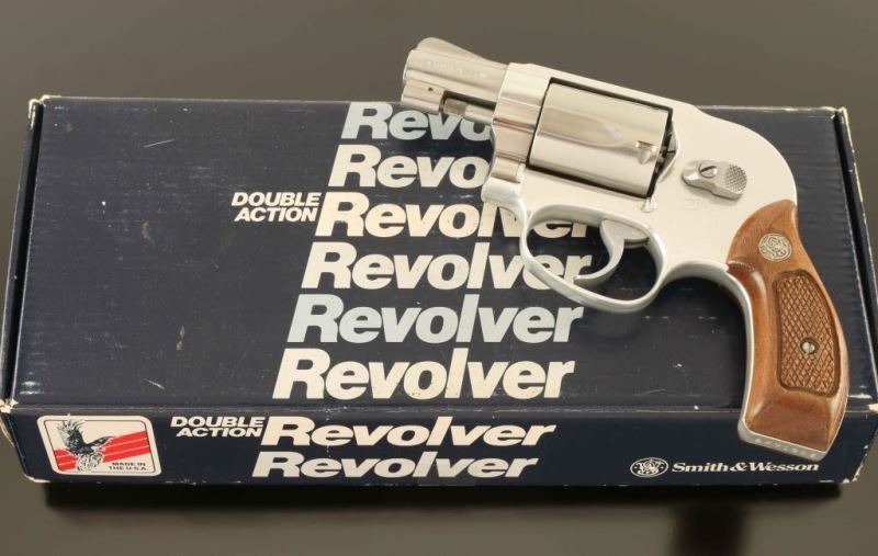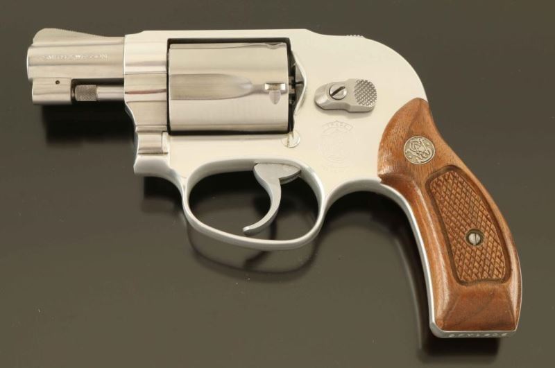 '.38 Bodyguard Airweight Stainless' Lightweight small frame double action revolver chambered in .38 Special, manufactured circa 1992. Features a brushed finished 2" stainless steel barrel with sighting rib, ramp front sight, square notched rear sight, fluted five-shot stainless steel cylinder, non-shrouded ejector rod, smooth .312 " combat trigger, shrouded hammer with serrated spur, three screw clear anodized round butt alloy J frame and two-piece checkered walnut Magna grips with silver S&W medallions. Includes the original factory one-piece blue cardboard box with documents, tools, paper, and correct label. Revolver exhibits a thin drag line on the cylinder and some light handling wear. Action is strong with very good lock up. Bore is pristine and wood grips are very good. Condition is NRA Very Good+++ ***Modern Firearm***
