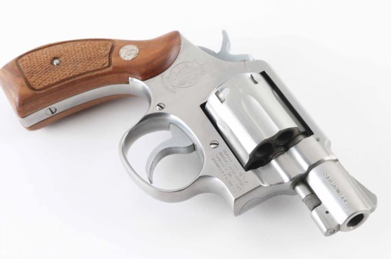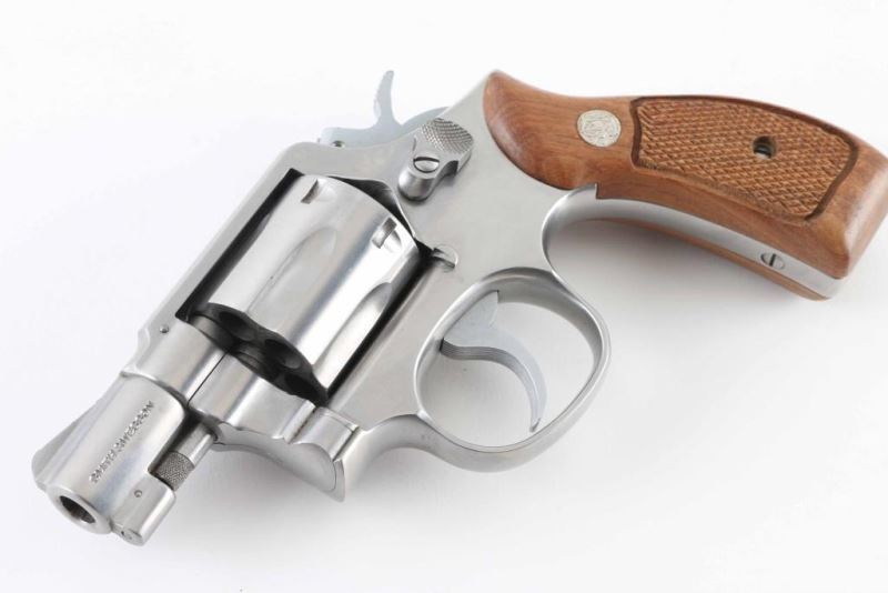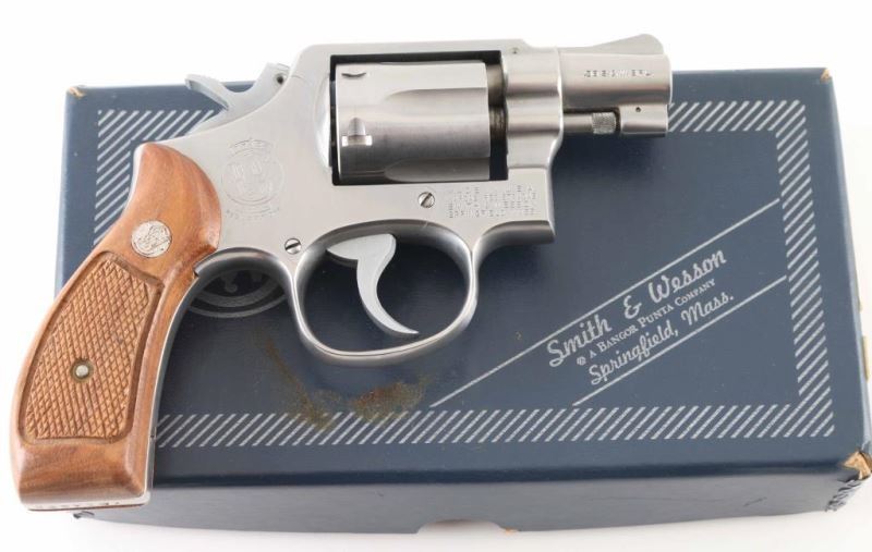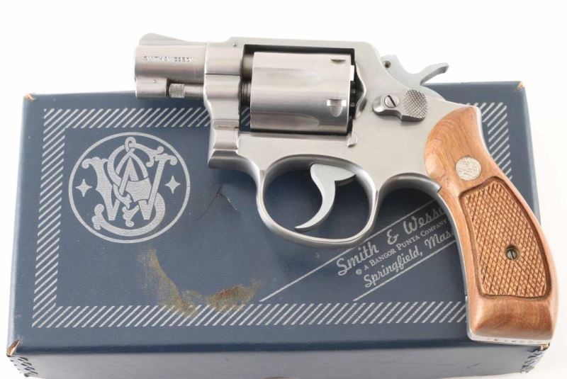 Double action revolver features stainless steel construction, checkered wood "magna" grips with S&W medallions, 2" barrel, serrated ramp front and fixed rear sights, square butt, "K" frame, 6 shot fluted cylinder. Overall condition is very good with smooth operation, tight lock-up, minor handling marks, very good bore. Grips are very good condition. Includes 2 piece blue factory cardboard box with paperwork. Condition is NRA Excellent *** Modern Firearm ***