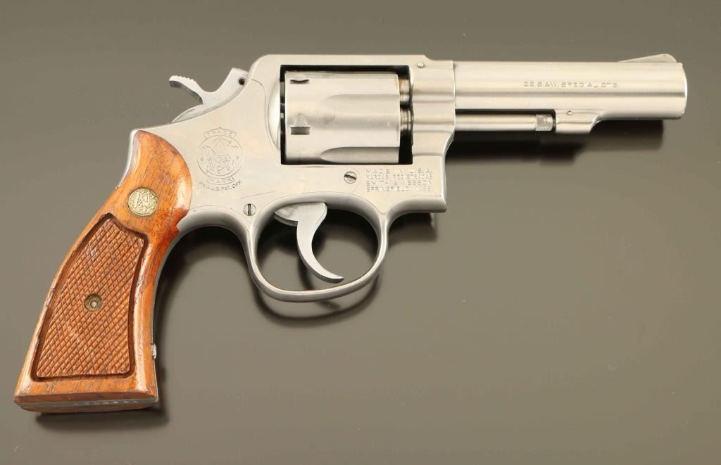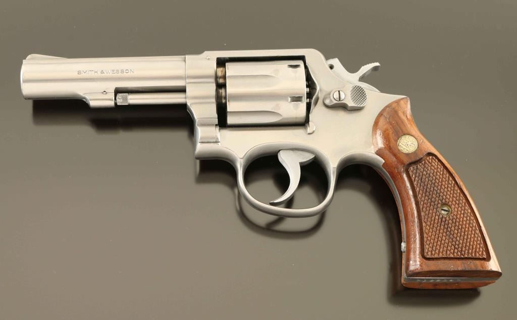 'The .38 Military & Police Stainless' Stainless steel medium frame double action revolver chambered in .38 Special, manufactured circa 1977-1982. Features a satin stainless finish, 4" heavy barrel with wide matte sighting rib, serrated ramp front sight, square notched rear sight, fluted six-shot cylinder, non-shrouded ejector rod, serrated .265" service trigger, .265" hammer with knurled spur, three screw square butt K service frame, and two-piece checkered walnut Magna grips with silver S&W medallions. Revolver exhibits moderate handling wear and shows some scattered dings and scrapes. Action is crisp with very good lock-up, the bore is excellent, and the wood grips are good with mild imperfections. Condition is NRA Good to Very Good. ***Modern Firearm***