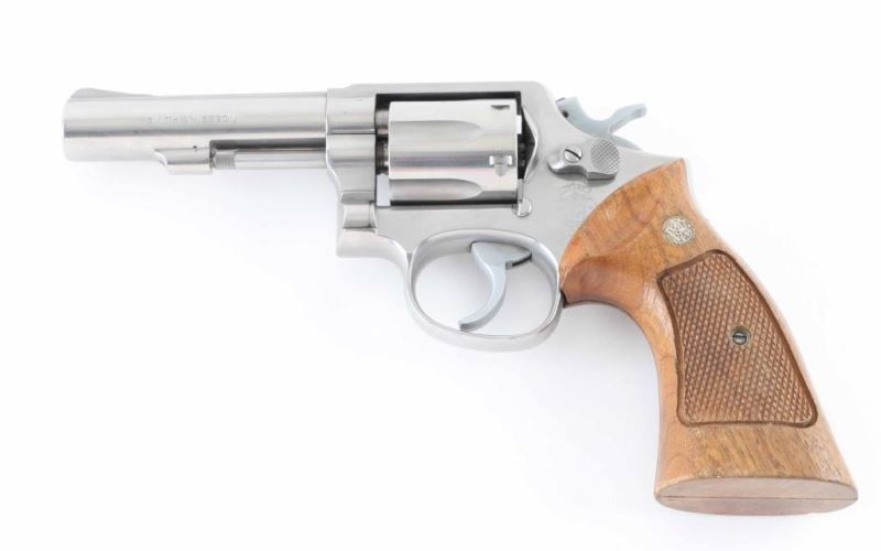 Double action revolver features stainless steel construction, checkered wood target grips with S&W medallions, 4" heavy barrel, serrated ramp front and fixed rear sights, square butt, "K" frame, 6 shot fluted cylinder. Overall condition is very good with smooth operation, tight lock-up, minor handling marks, very good bore. Grips are very good condition. Condition is NRA Excellent *** Modern Firearm ***
