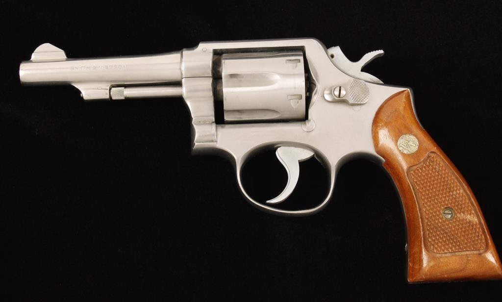 Stainless steel double-action 6-shot revolver with a 4" barrel, fixed sights and wood grips with checkered panels. Metal finish has a prominent drag line, many rubs and a few small dings. Bore is mirror bright with a few dirty spots and lots of sharp rifling. Chambers are shiny but dirty. Grips have a few rubs and dents with some wear through the finish. Action is very nice with rock solid lock-up. Condition is very good. *Modern Firearm*