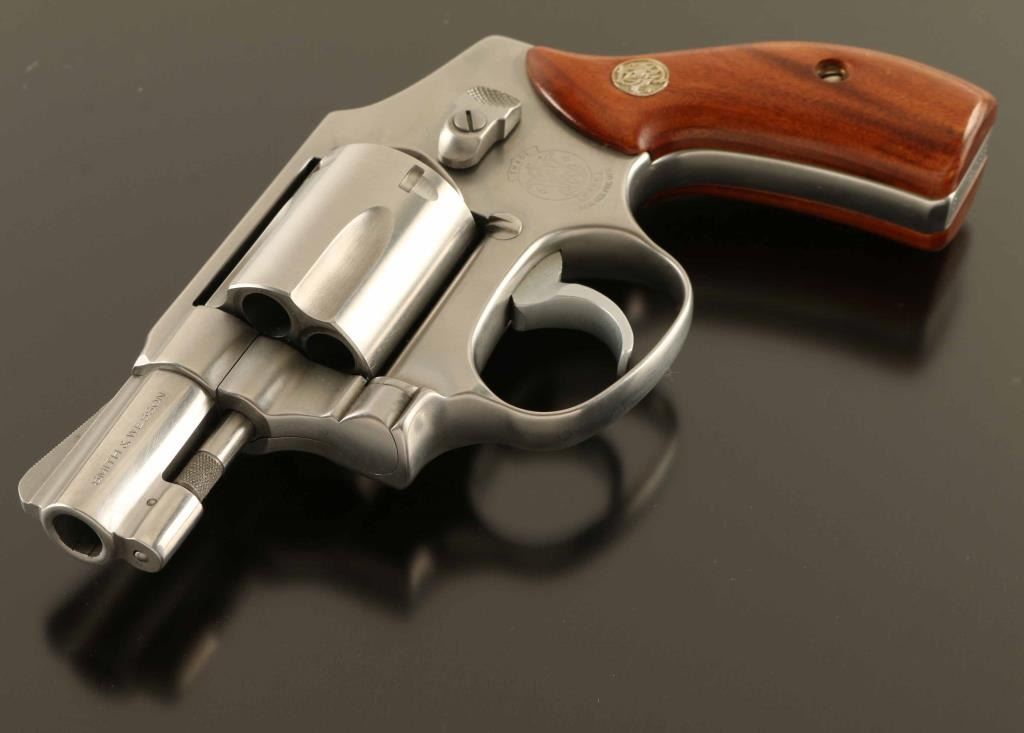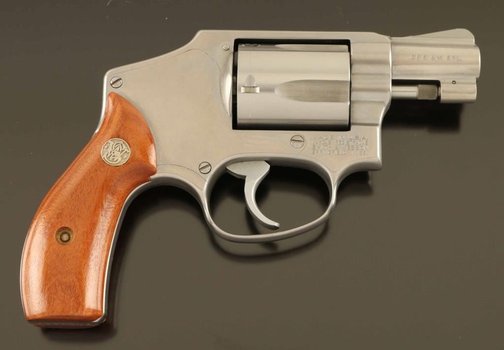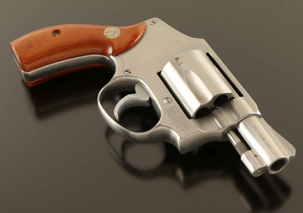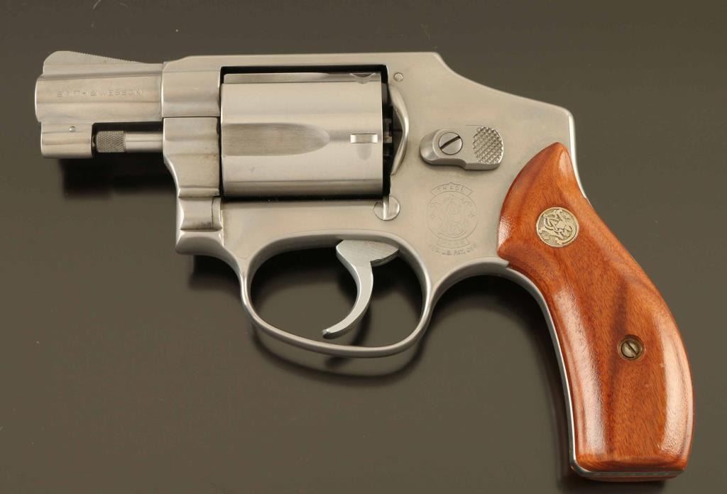 Revolver, 5-Shot. Hammerless. Stainless steel. brown wood grips (Round Butt) with S&W medallions. 2" barrel. Open notch sights. Bore, and cylinders appear excellent, but a little dirty. Finish is very good, with a couple of minor scuffs. Index tracks on the cylinder. Action is tight, and indexes properly. NRA Condition-Near Excellent. Modern Firearm