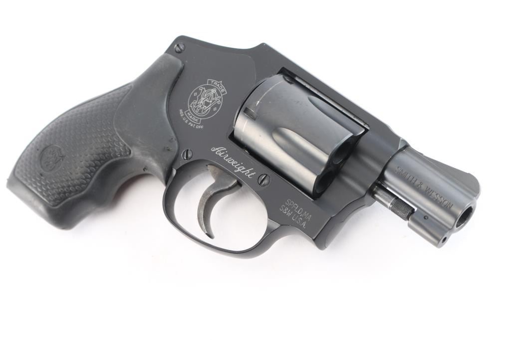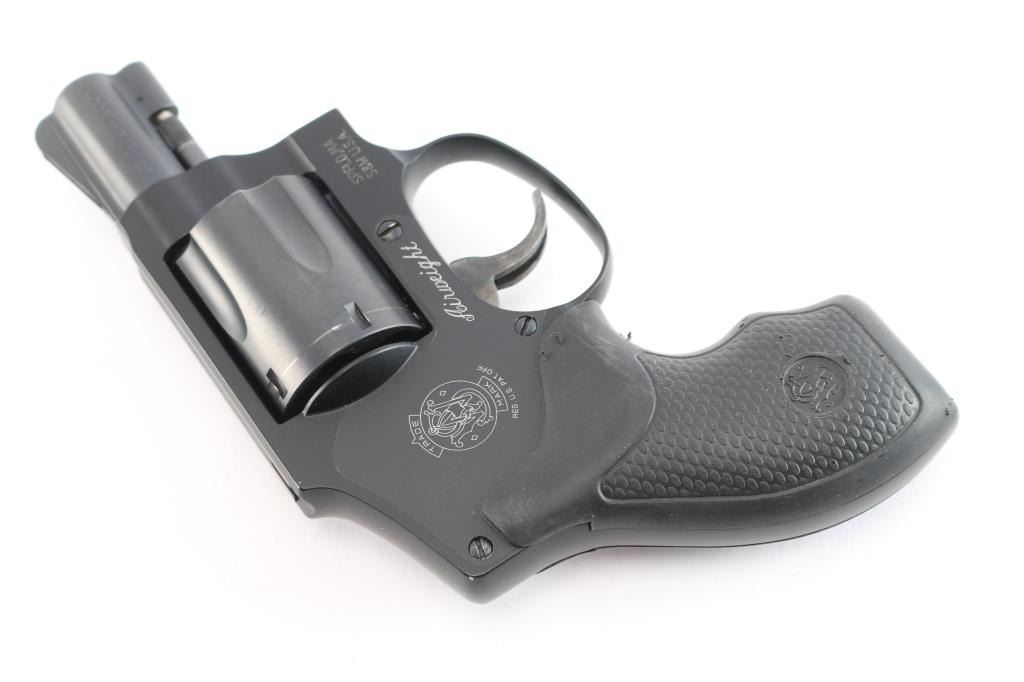 American made lightweight small frame double-action-only revolver rated for .38 Special +P ammunition. Dubbed the 'Centennial Airweight,' it was manufactured sometime after 1997 in Springfield, MA. It features a satin matte finish, a 1 7/8" stainless steel barrel, serrated ramp front sight, integral square notched rear sight, fluted five-shot stainless steel cylinder, non-shrouded ejector rod, internal key lock safety, case hardened smooth curved trigger, concealed hammer, and a two pebbled black rubber grips with S&W insignias. It is built on a black anodized finished three screw round butt aluminum alloy J frame. The bore is bright with strong rifling. The action is smooth with a tight lockup. The original black finish retained is approximately 99% with only a faint drag line on the cylinder. Includes a black nylon soft case with a speed-loader in a pouch.