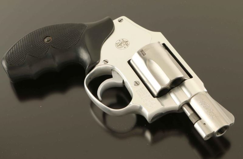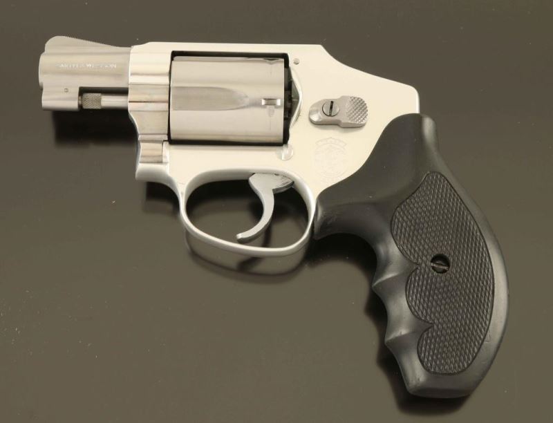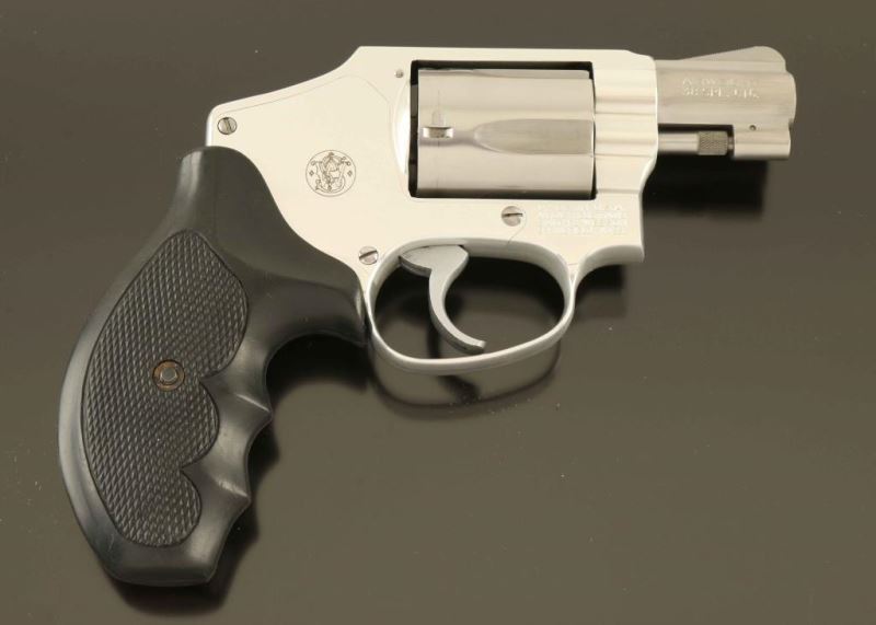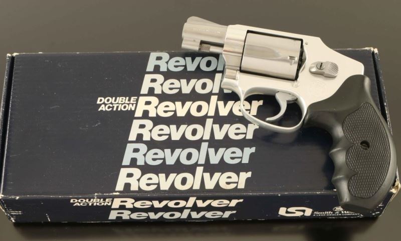 '.38 Centennial Airweight Stainless' Lightweight small frame double-action-only concealed hammer revolver chambered in .38 Special, manufactured circa 1991. Features a brushed finished 2" stainless steel barrel with sighting rib, serrated ramp front sight, square notched rear sight, fluted five-shot stainless steel cylinder, non-shrouded ejector rod, smooth .312" combat trigger, concealed hammer, silver finished three screw round butt alloy J frame and two-piece Uncle Mike's checkered black rubber boot grips. Includes a factory one-piece blue cardboard box with paper. Revolver exhibits a faint drag line on the cylinder and a couple of light handling marks. Action is strong with very good lock up, bore is excellent and the rubber grips are very good. Condition is NRA Excellent in box. ***Modern Firearm***