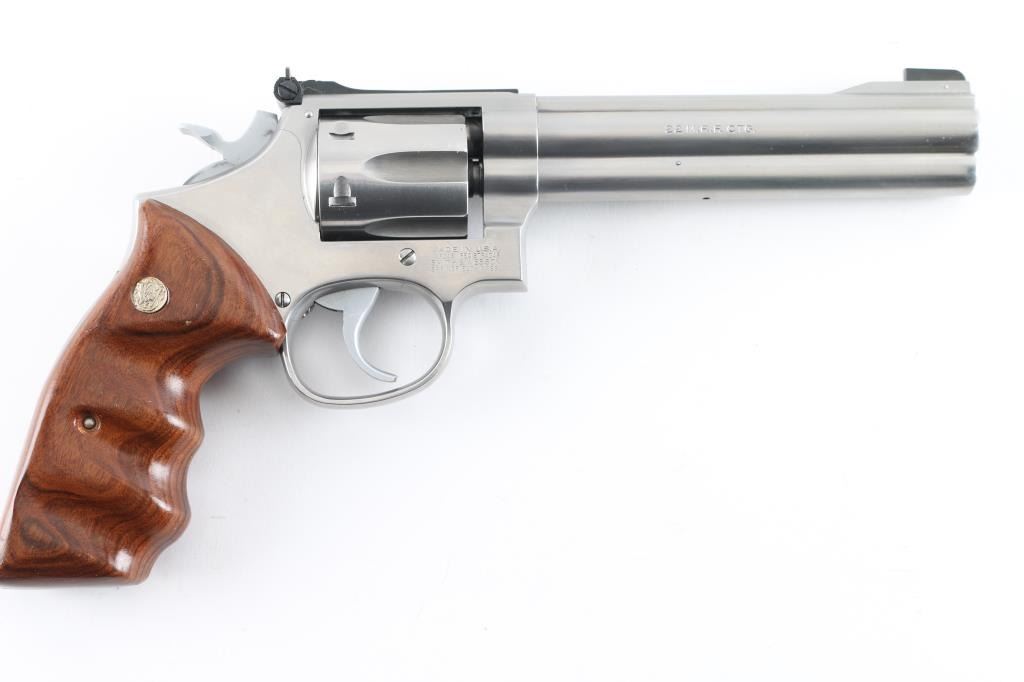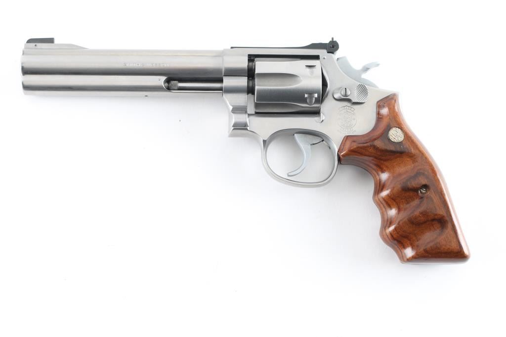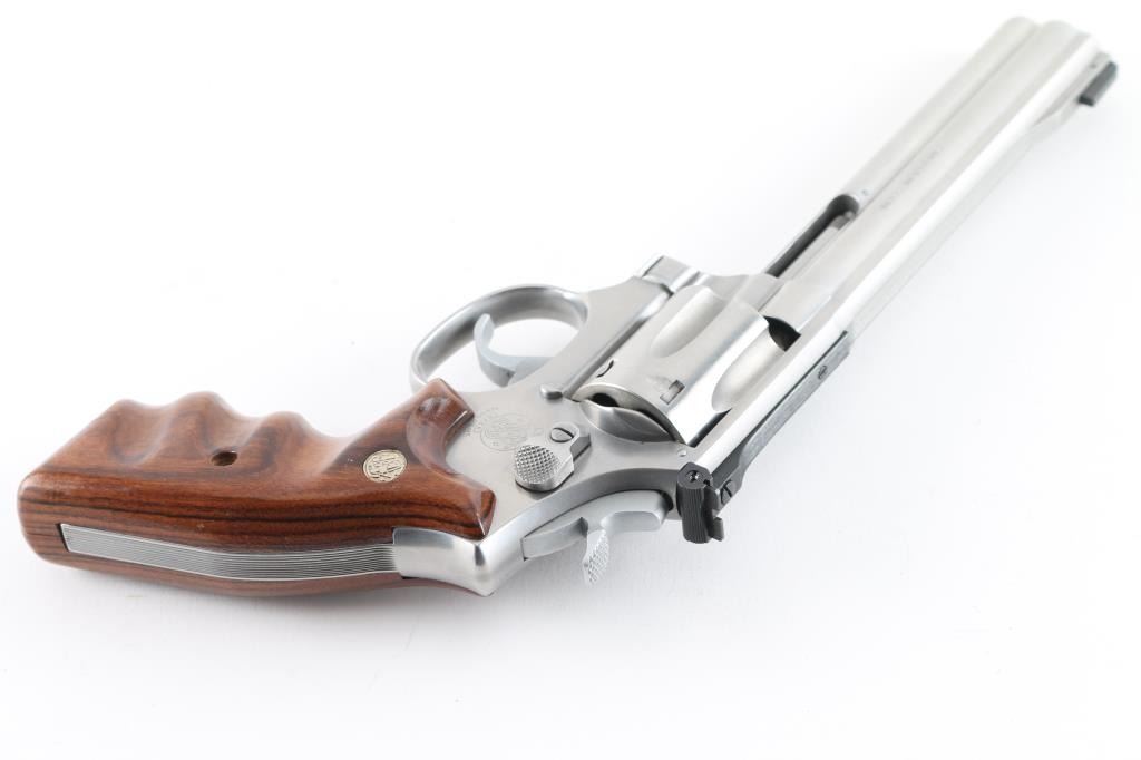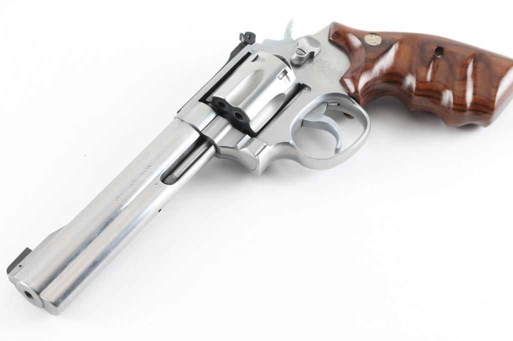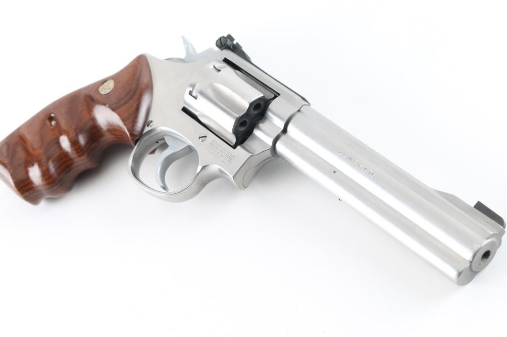 Stainless steel six shot revolver chambered for .22 Magnum cartridges. It has a 5.75" barrel, full underlug, fluted cylinder, raised blade front sight, adjustable rear sight, smooth hammer, knurled hammer spur, serrated back strap, two piece wood grips with finger grooves and S&W medallions. Metal finish looks very good. Wood grips look very good. Bore looks good, bright. Condition is NRA Very Good. *Modern Firearm*