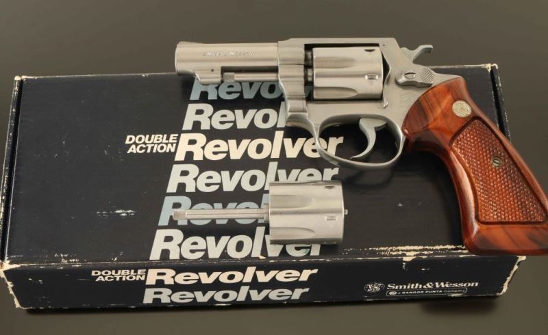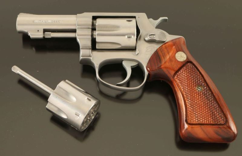'.22 M.R.F. Service Kit Gun Stainless' Stainless steel small frame double action revolver chambered in .22 Magnum Rimfire with a conversion .22 Long Rifle cylinder. Manufactured circa 1983. Features a brushed finish, ribbed 3" heavy barrel, serrated ramp front sight, square notched rear sight, fluted six-shot cylinder, non-shrouded ejector rod, smooth .312 " combat trigger, .240" hammer, transfer bar safety, three screw round butt J frame and two-piece checkered walnut Magna grips with silver S&W medallions. Includes the original factory one-piece blue cardboard box with documents, .22 LR conversion cylinder, and correct label. Revolver exhibits a faint drag line and light handling marks. Action is strong with very good lock up, bore is pristine and the wood grips are fine. Condition is NRA Very Good+++ ***Modern Firearm***