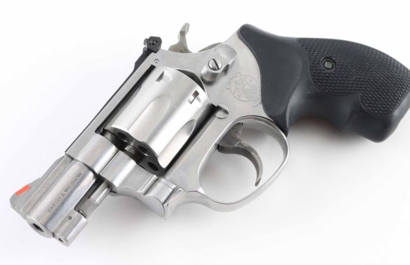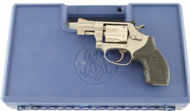 Double action rimfire revolver features stainless steel construction, black checkered rubber "boot" grips with finger grooves, 2" barrel, orange ramp front and adjustable black rear sights, round butt, "J" frame, 6 shot fluted cylinder. Overall condition is excellent with smooth operation and tight lock-up, minor handling marks, very good bore. Grips are very good condition. Includes factory blue plastic box, spare set of grips (smooth wood with S&W medallions), manual. Condition is NRA Excellent *** Modern Firearm ***
