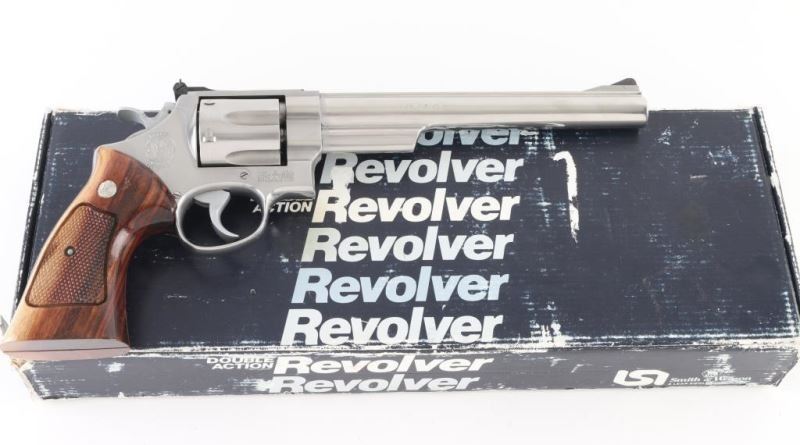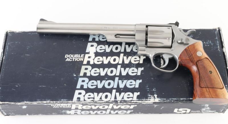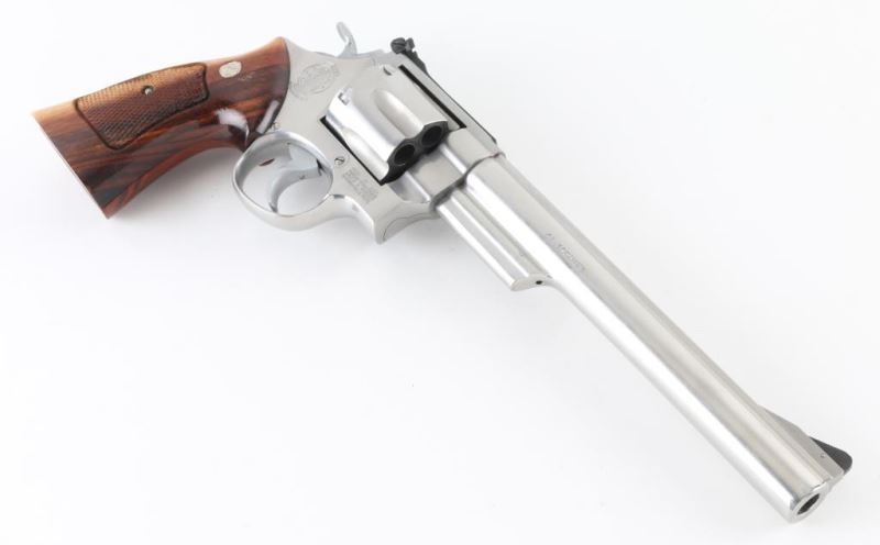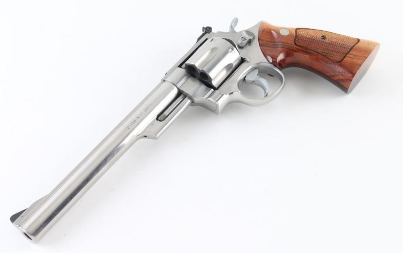Modern 5 shot stainless revolver chambered for .41 magnum ammo. 8-3/8" barrel, stainless finish, checkered target stocks with S&W medallions, smooth combat trigger and knurled target hammer. Fluted cylinder, serrated ramp on ramp front sight adjustable rear sight. Finish shows some signs of handling with a slight drag line on the cylinder but overall great shape as are the wood grips with only a tiny scuff on the right side next to the medallion. Bore looks great just dusty. NRA Very Good+ Modern Firearm