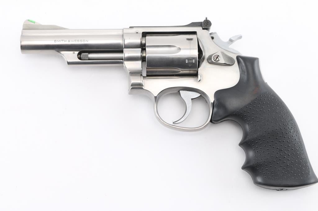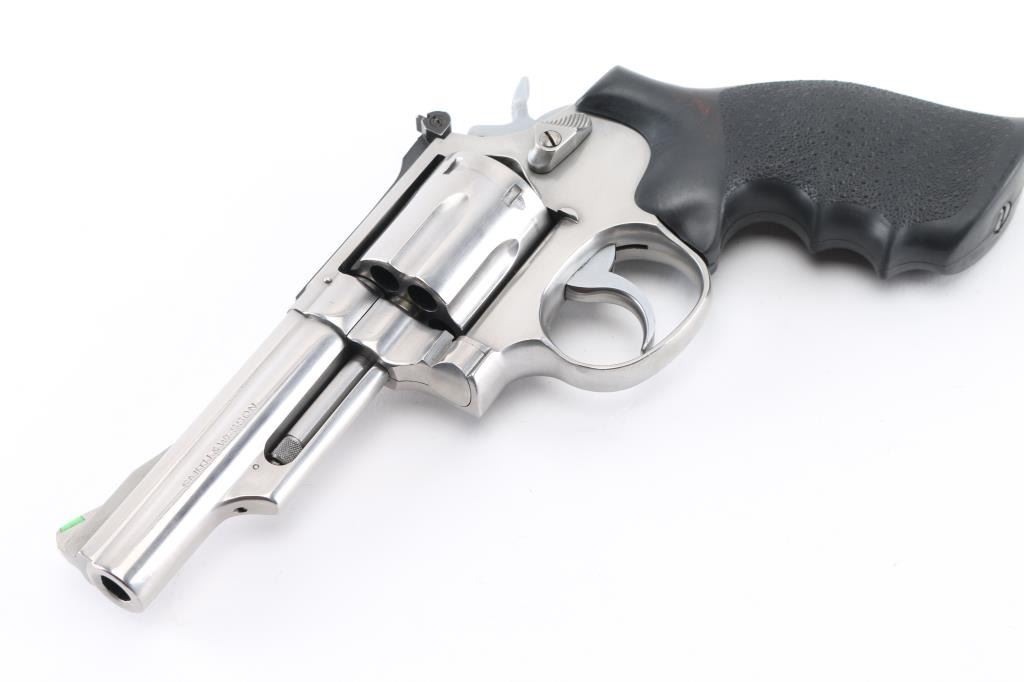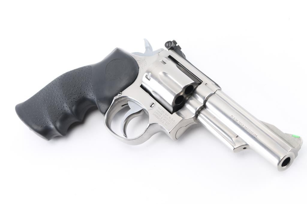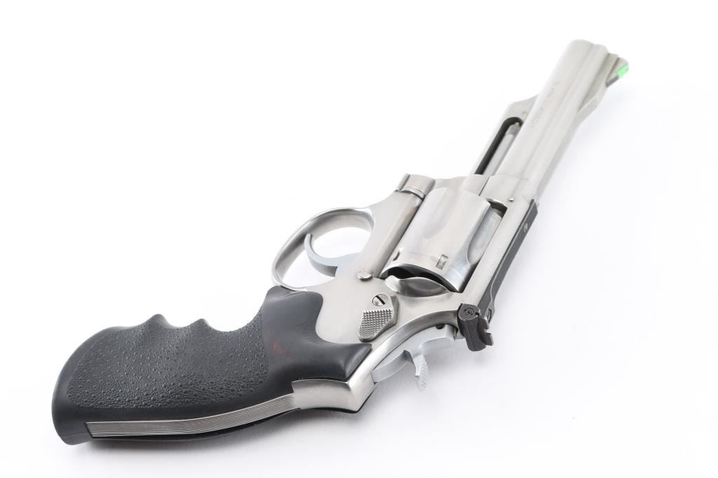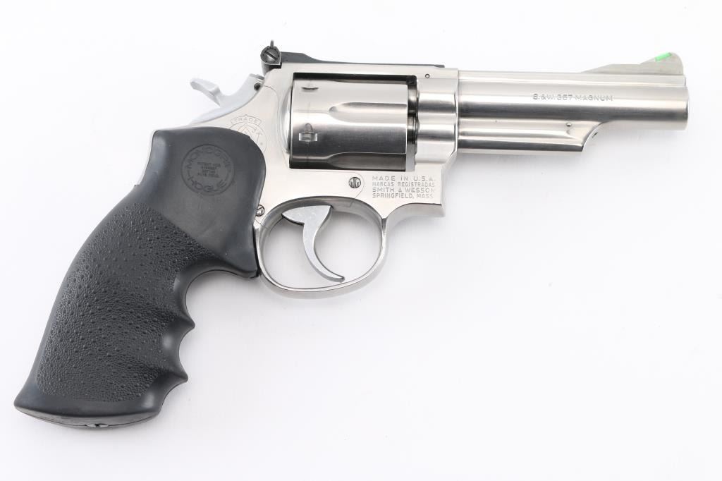 "Pinned and recessed" stainless steel double action six shot revolver chambered in .357 Magnum, 4" stainless steel partial serrated ribbed barrel with serrated ramp front sight with green insert and adjustable square-notched rear sight, stainless steel frame with smooth trigger, checkered hammer spur, side cylinder release button and shrouded extractor rod, serrated backstrap and square butt frame, black rubber Hogue Monogrip. Retains 99% of it's finish with hardly and signs of wear. Fluted cylinders and bore are excellent. Action is smooth and tight. Condition is NRA Excellent. Modern Firearm.