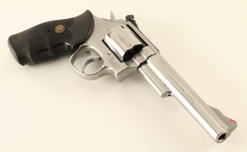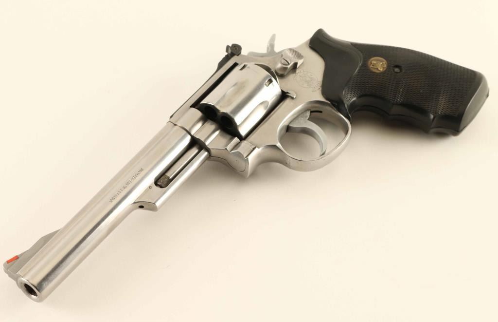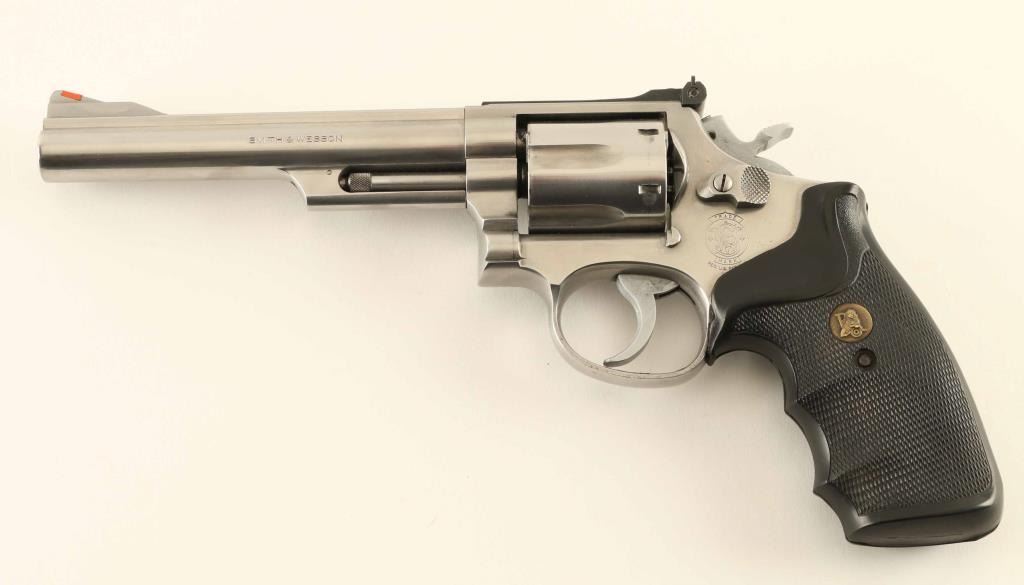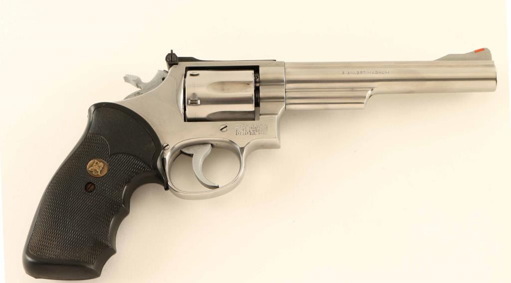 Revolver. Double-action. 6-rd capacity. Built on the stainless steel K target frame. Stainless version of the Model 19 with round butt. 6" round, ribbed, barrel, with serrated red ramp front sight. Micrometer, adjustable click square notch rear sight. shrouded extractor rod. 10-groove serrated backstrap, and fore strap. Serrated trigger. Non-original checkered black rubber Pachmyer grips. Model 66-3-1986. Produced 1970-2004. Action is crisp/tight. Bore, and cylinder chambers appear excellent/bright. Grips are excellent. Stainless finish has some minor scratches/rubs, and drag lines on the cylinder. NRA condition-Very good, Plus. Modern firearm.