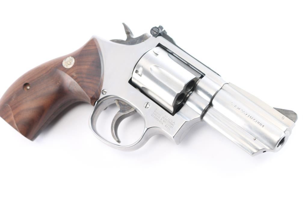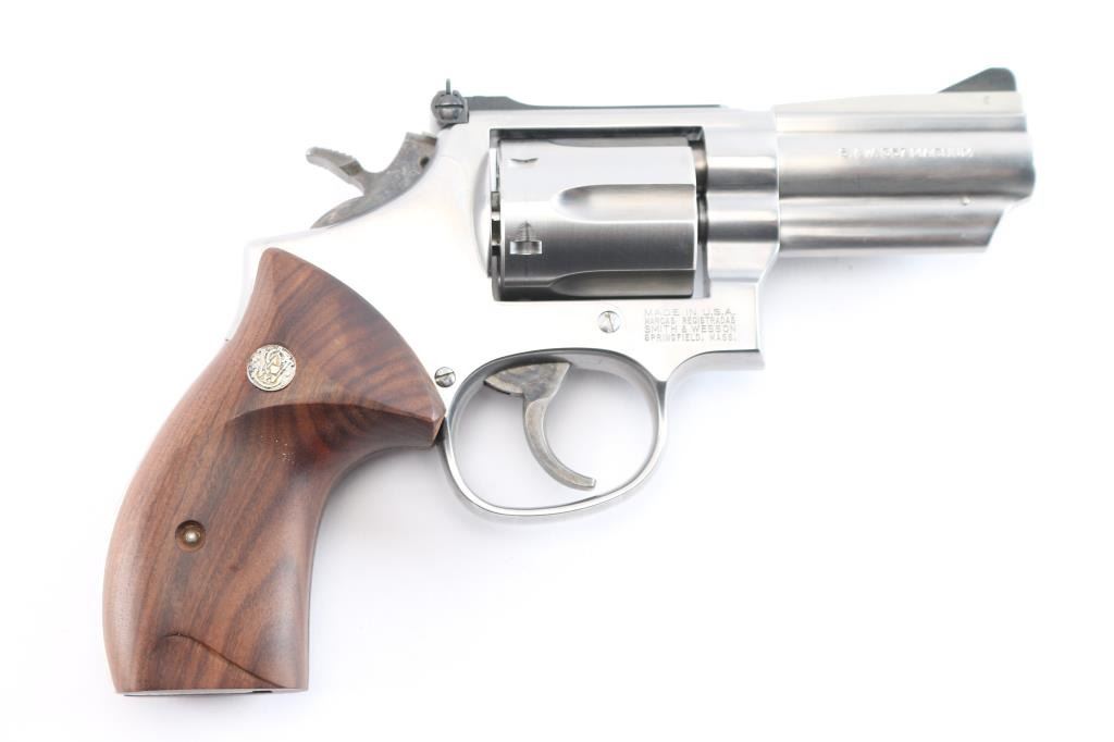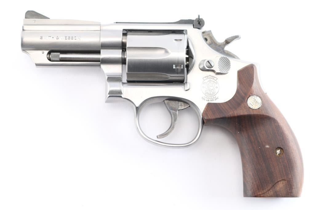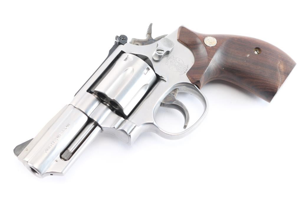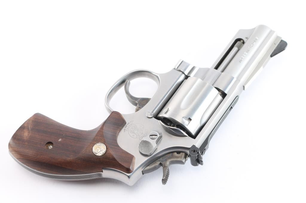 'Combat Magnum' Medium frame stainless steel double-action revolver chambered in .357 Magnum, circa 1995-1998. Features a stainless steel finish, case colored hammer & trigger, 3" barrel with solid top rib, shrouded ejector rod, raised ramp serrated black front sight , micrometer click adjustable rear window sight with white outline (Faded), fluted six-shot cylinder, smooth combat trigger, semi target hammer with serrated hammer spur, smooth wood grips with silver S&W medallions. Bore is excellent/bright, metal finish looks very good with minor scratches, wood grips look very good, action is smooth with tight lock-up.