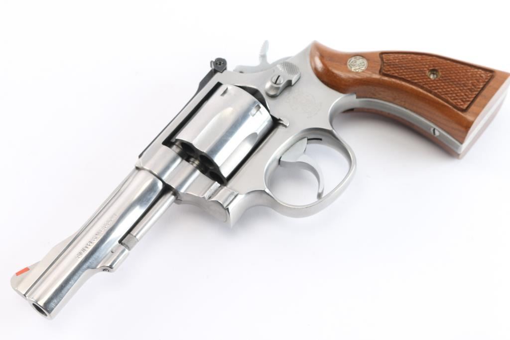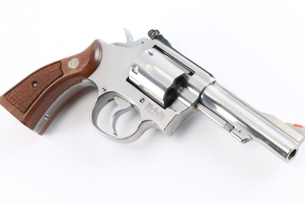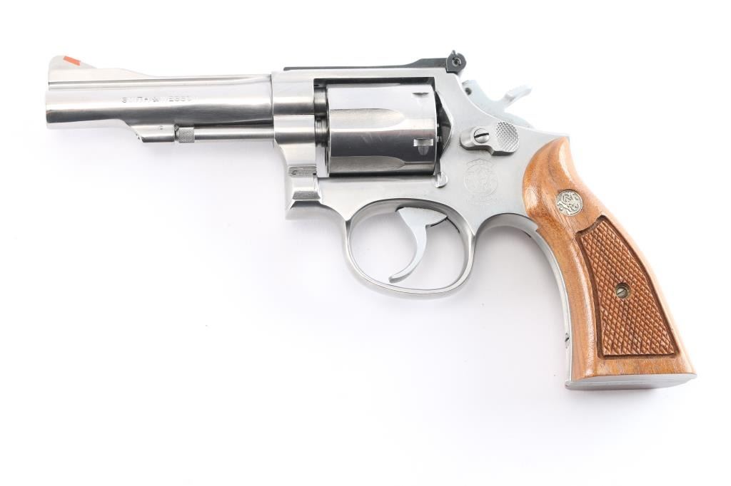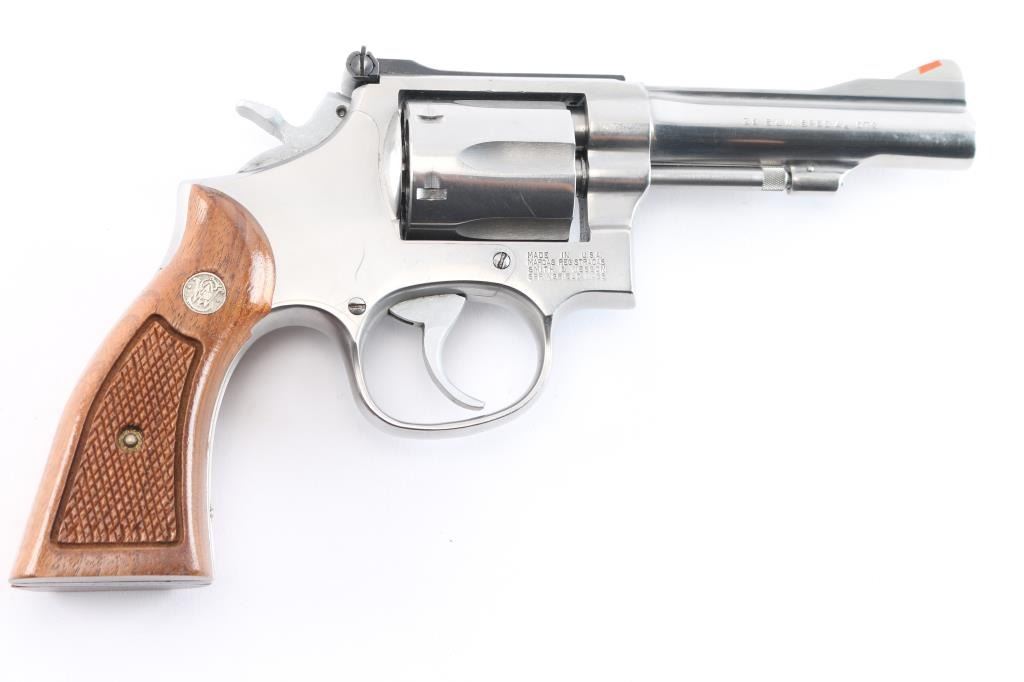 "The .38 Combat Masterpiece". American made six shot revolver chambered for .38 Special ammunition. Built on a square butt K target frame. It features stainless steel construction, a 4.1/8" barrel, raised ramp front sight with orange insert, adjustable rear sight, fluted cylinder, knurled hammer spur and cylinder release. It has two piece wood grips with checkered grip panels and S&W medallions with a serrated back & fore strap. Metal finish looks good with minor scratches, & track line on cylinder. Wood grips are very good. Bore looks excellent, bright. Action is smooth with tight lock-up.