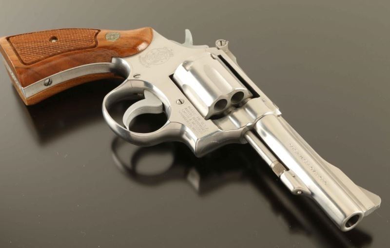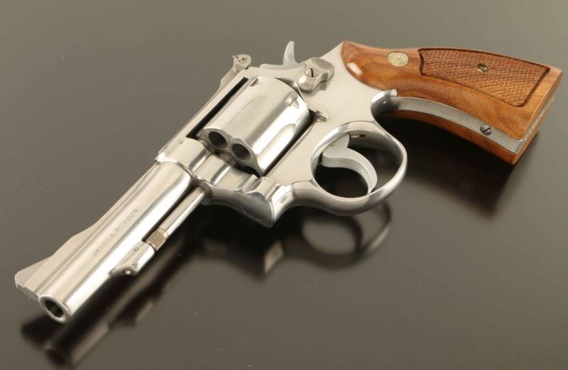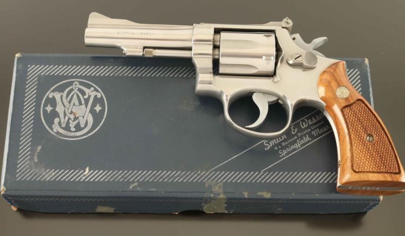 '.38 Combat Masterpiece Stainless' Stainless steel medium frame double-action revolver chambered in .38 Special, manufactured circa 1973. Features a polished finish, pinned 4" barrel with serrated siding rib, non-shrouded ejector rod, raised ramp front sight, stainless steel adjustable micrometer click rear sight, fluted six-shot cylinder, serrated .265" trigger, .375" semi target hammer, three screw square butt K target frame and two-piece checkered walnut Magna grips with silver S&W medallions. Includes the original factory two-piece blue cardboard box with matching label. Revolver exhibits a faint drag line on the cylinder with little other wear observed. Action is smooth with tight lock-up, bore is pristine, and wood grips are fine. Condition is NRA Excellent in box. ***Modern Firearm***