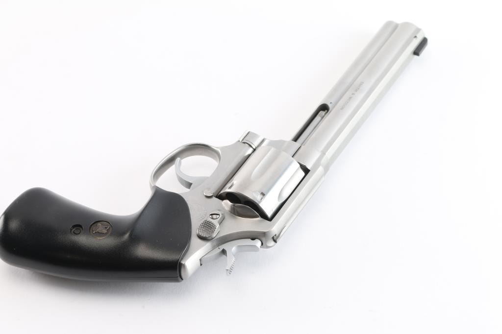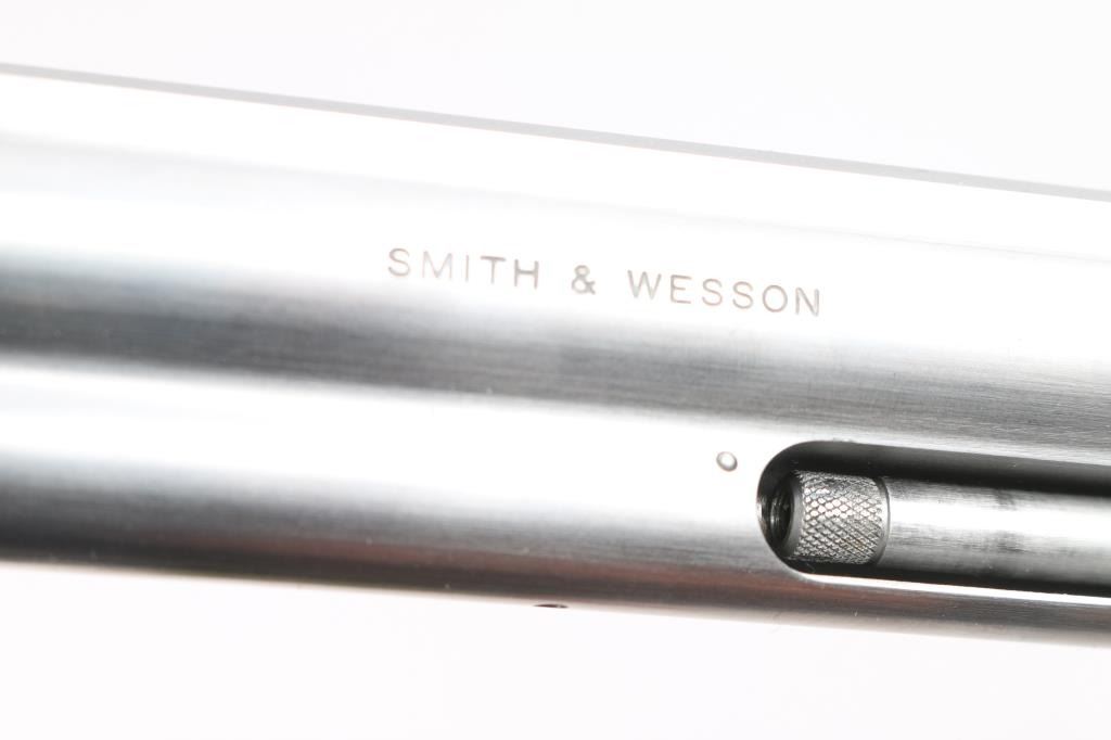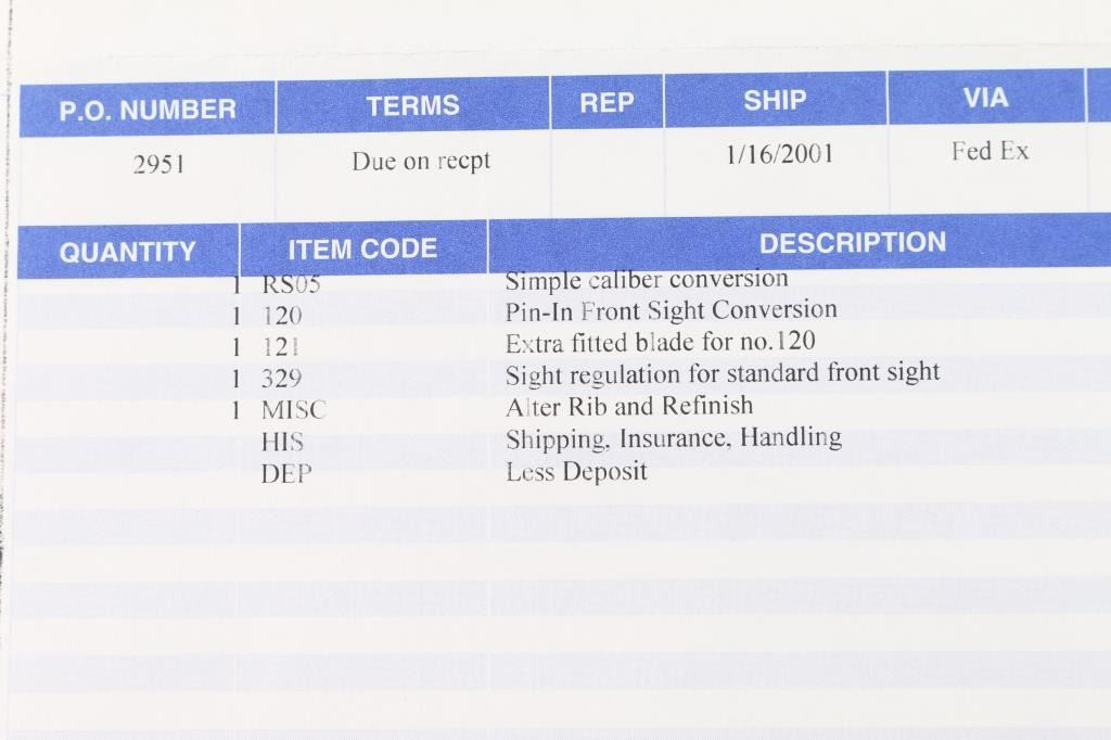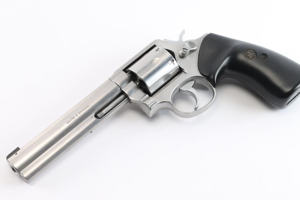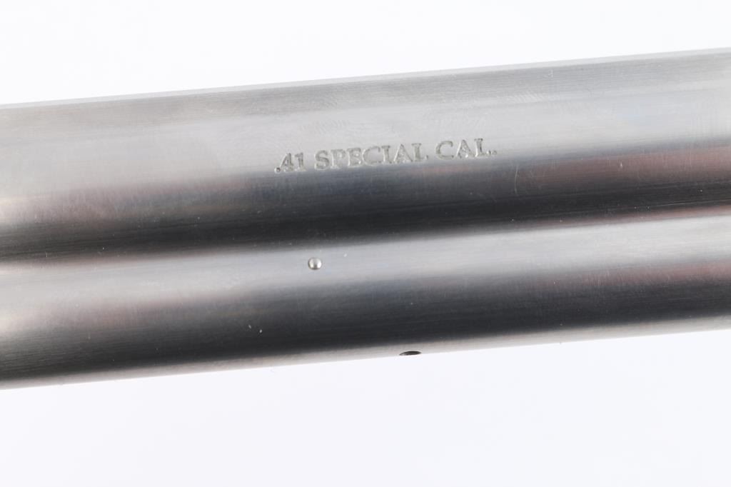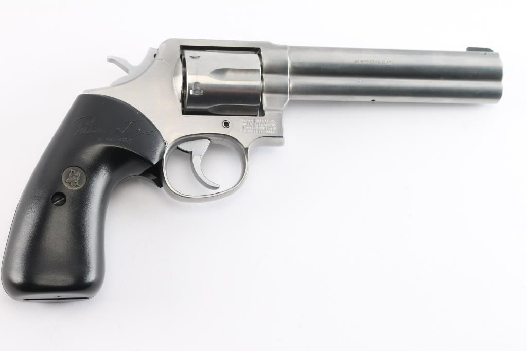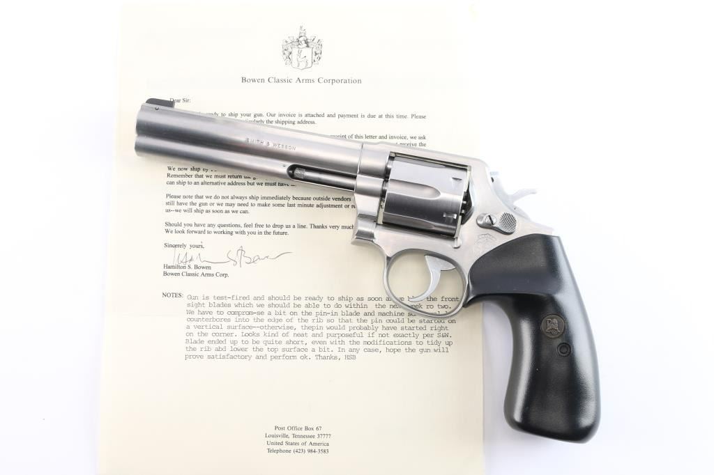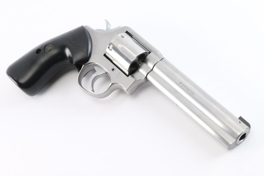 'Bowen Classic Arms' caliber conversion. Large frame double/single action revolver. Built on the square butt L frame with 3 screws, stainless steel finish, 6" full-lug ribbed barrel, .265" service hammer, .312" smooth combat trigger, 6-shot fluted cylinder, smooth black polymer Pachmayr Bill Jordan Combat Grips. Originally chambered in .357/.38, Bowen Classic Arms did the caliber conversion to .41 Special along with a new pin-in blade front sight with rib altercation and refinish. The right side of the barrel is now marked ".41 special cal." The Bowen Classic Arms invoice/paperwork is included. The bore is excellent/bright, the action is smooth with tight lock-up, the finish is overall excellent with slight tracking on the cylinder and there is 3/4" chip out of the underside of the grips by the triggerguard. Manufactured 1980-92.