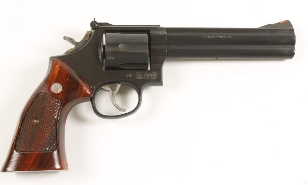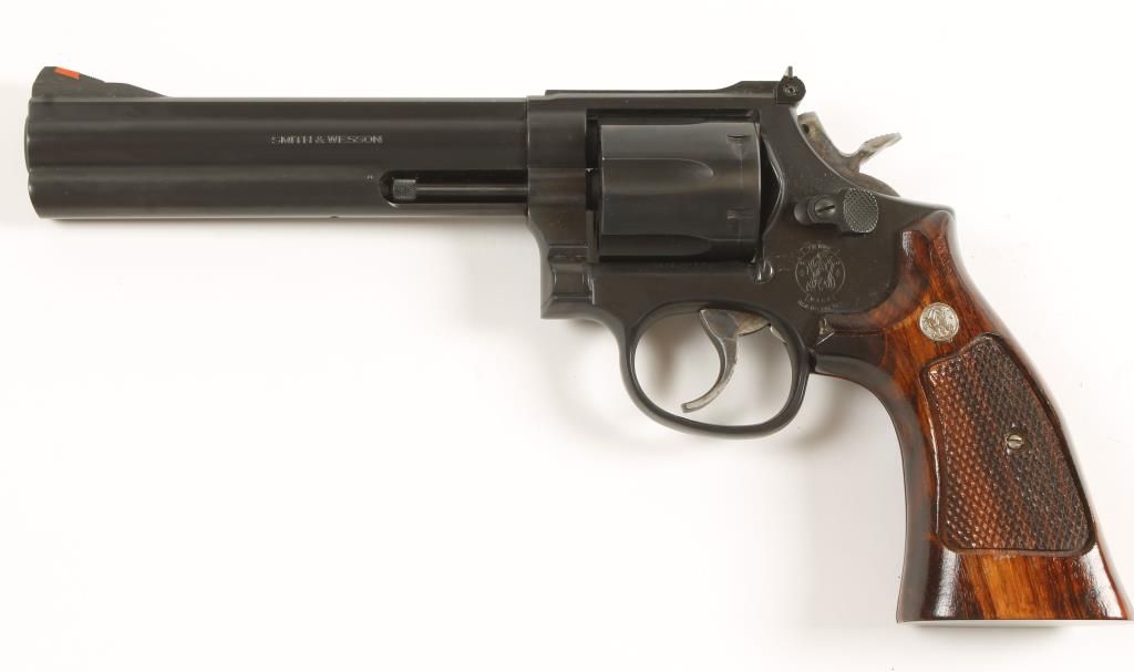 Double action 6-shot revolver. Blued with case colored hammer and trigger. Target sights with adjustable rear. Orange front blade insert. Wide spur target hammer. Full underlug and top rib barrel. Serrated top rib. Slight drag line beginning. Action is tight and in very good working order. Condition: Good to Very Good with bright bore and strong rifling. *Modern Firearm*
