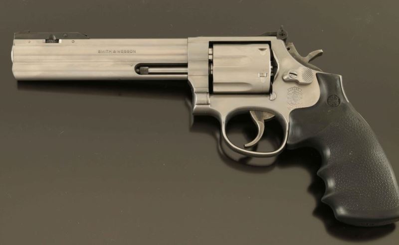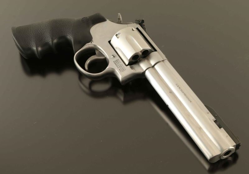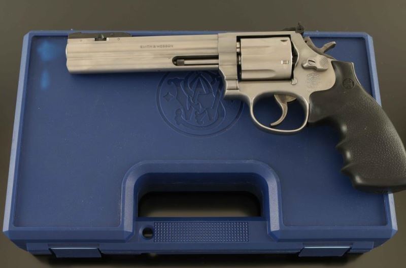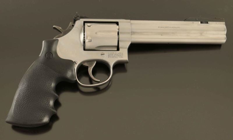 'The .357 Distinguished Combat Magnum Stainless' Stainless steel medium frame double-action revolver chambered in .357 magnum, manufactured circa 1995. Features a brushed finish, ribbed 6" barrel with full underlug, adjustable four-position front sight, adjustable micrometer click rear sight, fluted six-shot cylinder, smooth .312" combat trigger, .375" semi-target hammer, three screw round butt L target frame with ten-groove serrated grip straps and one-piece pebbled black rubber Hogue Monogrip with S&W insignias. Includes the original factory blue hard case with documents, tool and matching label. Revolver exhibits drag wear on the cylinder and has been heavily cleaned. Action is smooth with tight lock-up, bore is pristine and the rubber grip is fine. Condition is NRA Very Good+++ in case. ***Modern Firearm***