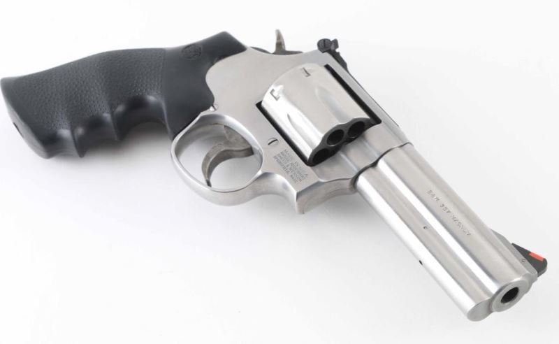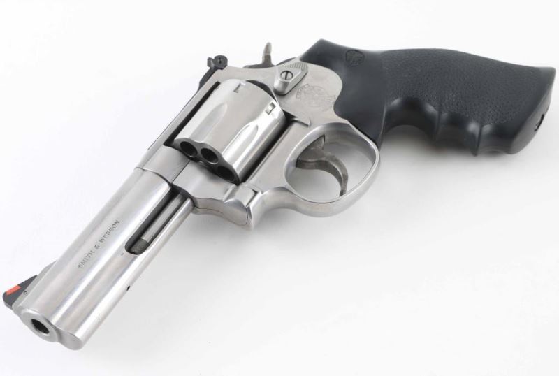 "7 shot" double/single action revolver built on the "L" frame, features stainless steel construction, contoured rubber Hogue style target style grips with molded-in S&W medallions, 4" barrel with full length underlug, adjustable sights with orange ramp and white outline rear. Bore is excellent. Overall condition is excellent with few signs of handling and use. Action is smooth with tight lock-up. Includes factory blue plastic box, (2) speed loaders. Condition is NRA Excellent *** Modern Firearm ***