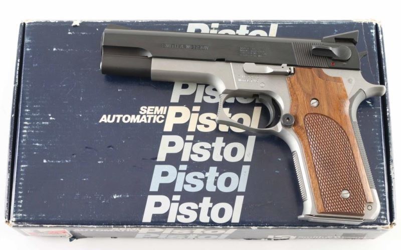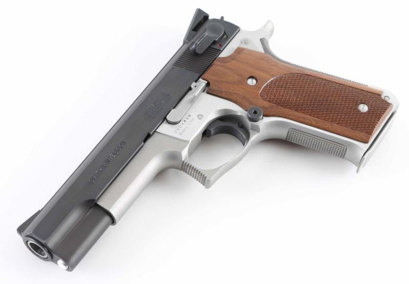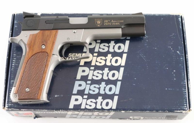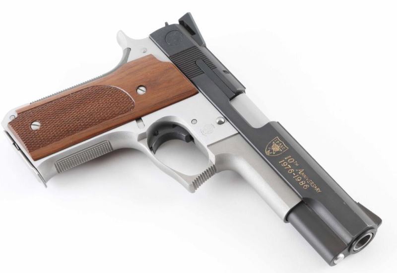 'IPSC 10th Anniversary' edition semiautomatic pistol features single action trigger, two tone finish with blued slide over stainless steel frame, gold color inlaid engraving on right side of slide "10th Anniversary / 1976-1986" next to IPSC logo, checkered wood grips, serrated ramp front sight, square notch rear sight in dovetail, slide mounted firing pin block safety, 5" barrel. Bore is in excellent condition. External appearance is like new with few handling marks, small amount of bare metal visible on some sharp edges. Includes factory box & manual, (2) magazines. Condition is NRA Excellent - like new *** Modern Firearm ***