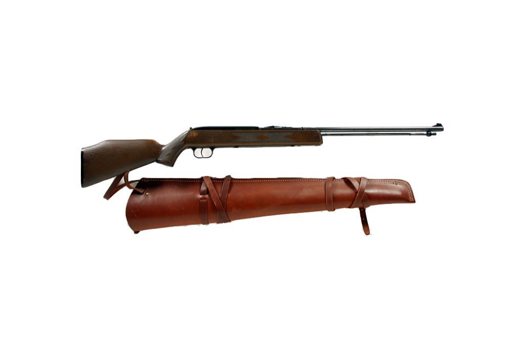 Smith & Wesson Airgun Mdl 80G Cal .177 SN:016592, CO2 powered pellet gun by the famous maker of Smith & Wesson revolvers. Blued finish, wood grained plastic checkered pistol grip stock, 20" barrel, adjustable sight. Condition: Looks very nice with soSN:016592, CO2 powered pellet gun by the famous maker of Smith & Wesson revolvers. Blued finish, wood grained plastic checkered pistol grip stock, 20" barrel, adjustable sight. Condition: Looks very nice with some wear to the stock, probablyfrom carry in the included leather rifle scabbard. Functionality unknown (No CO2 cartridges!)