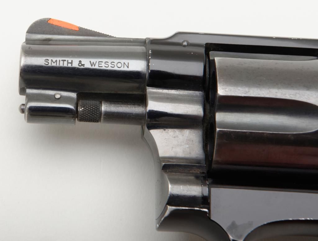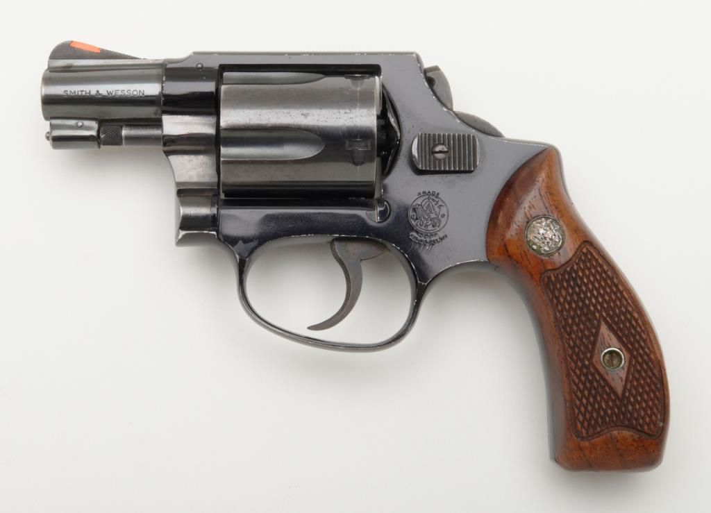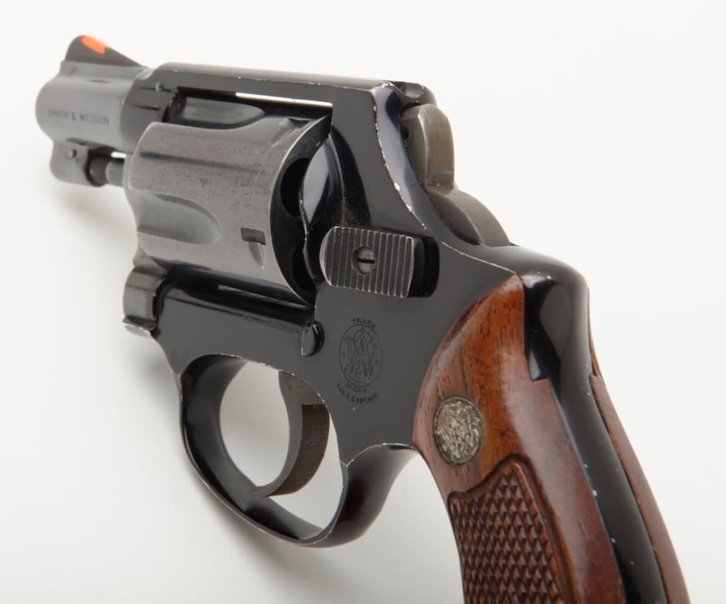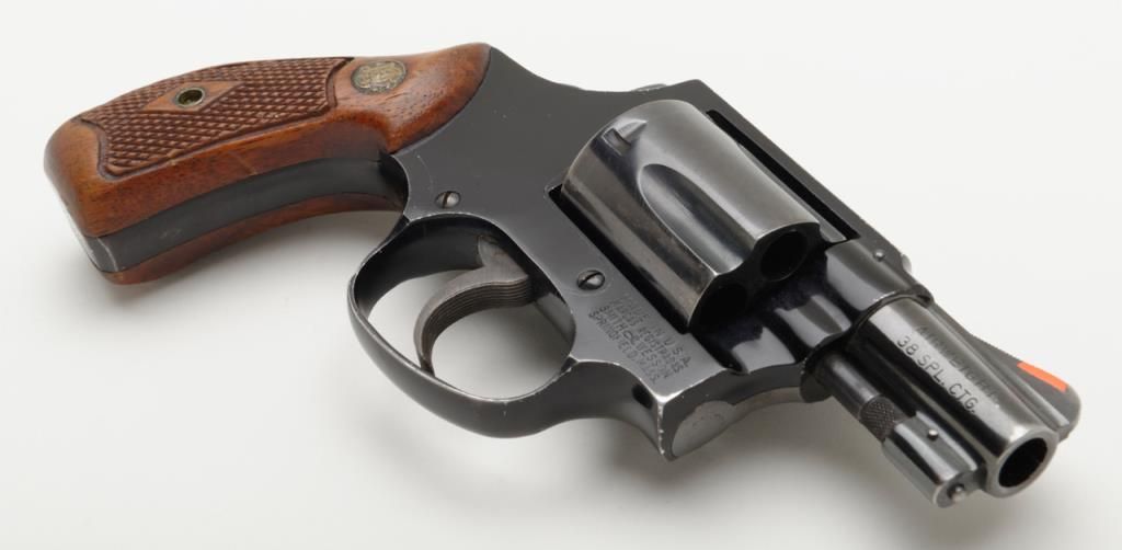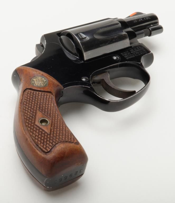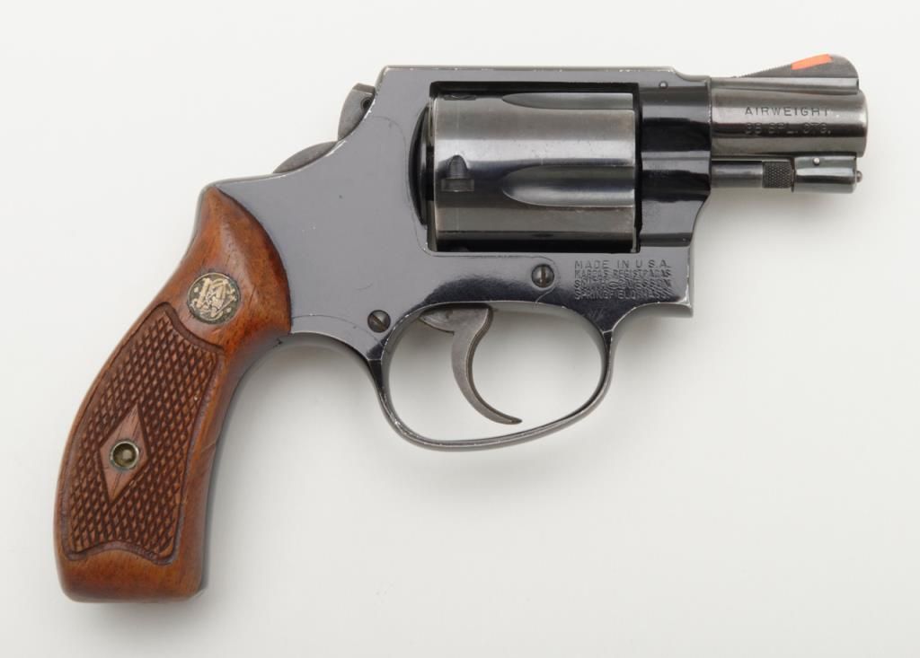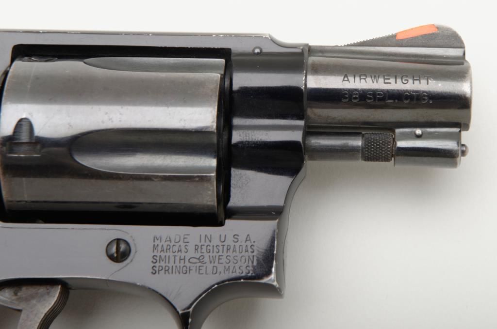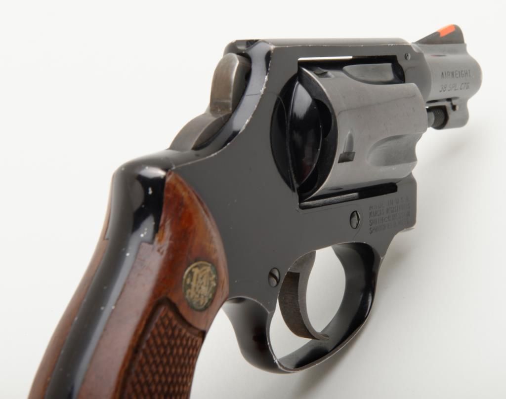 Smith & Wesson Airweight model, .38 special, double action revolver in good to very good used condition, serial number 329663. The hammer has been bobbed and a red ramp front sight has been added. Approximately 80% original finish, good action and good bore. Est.: $250-$500