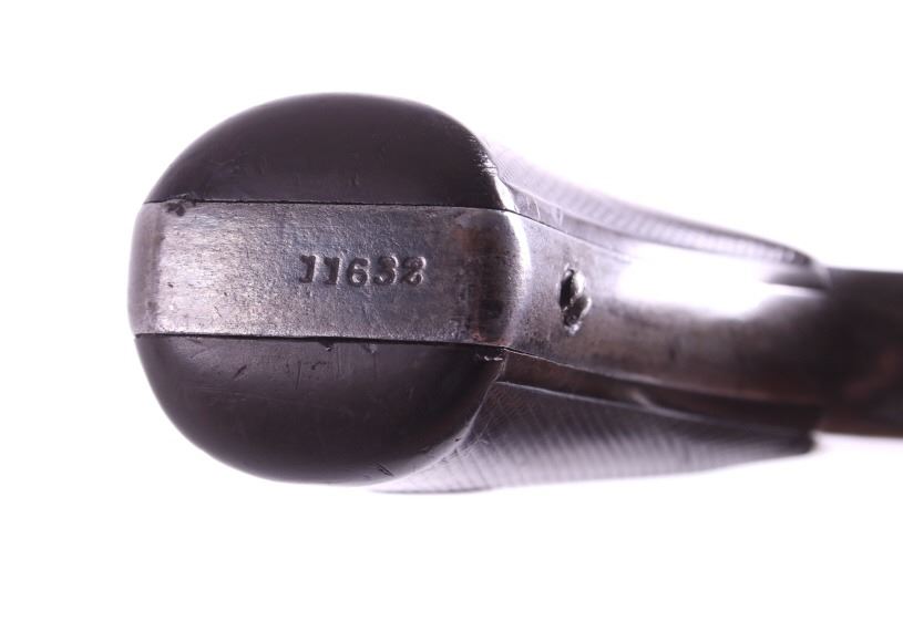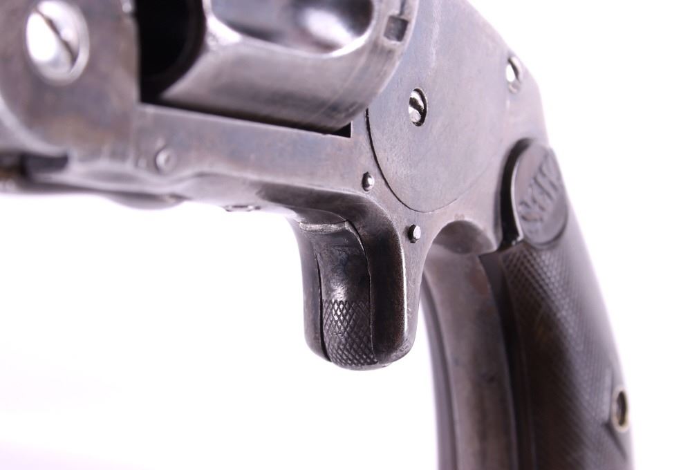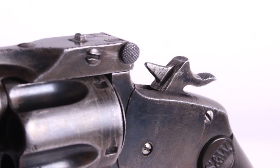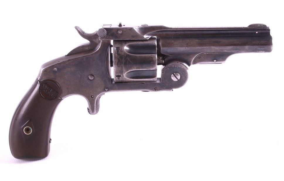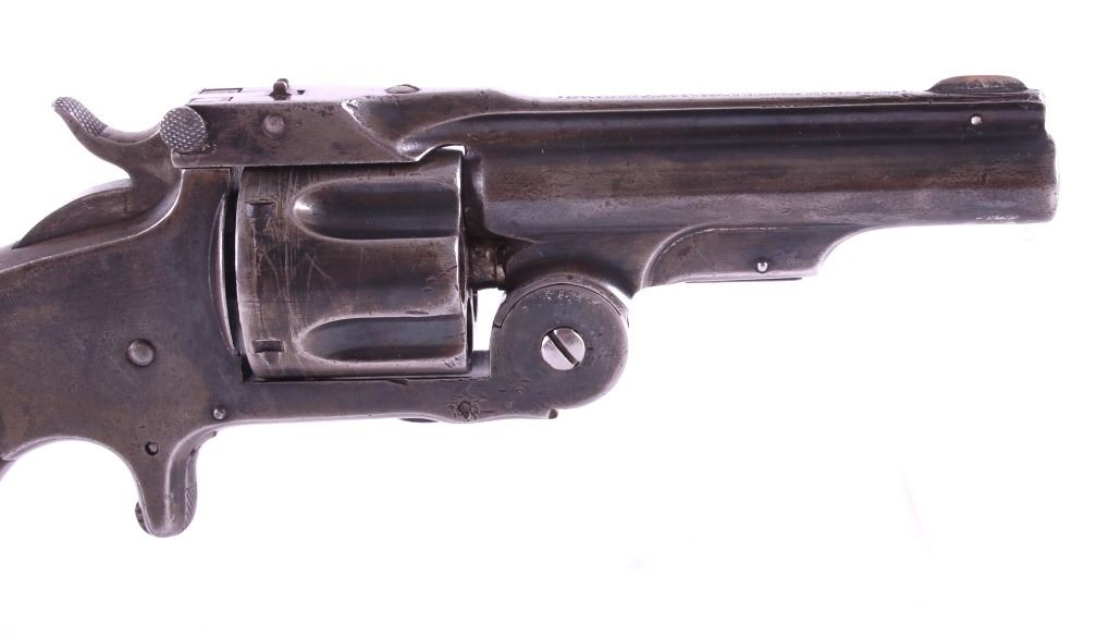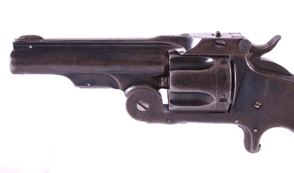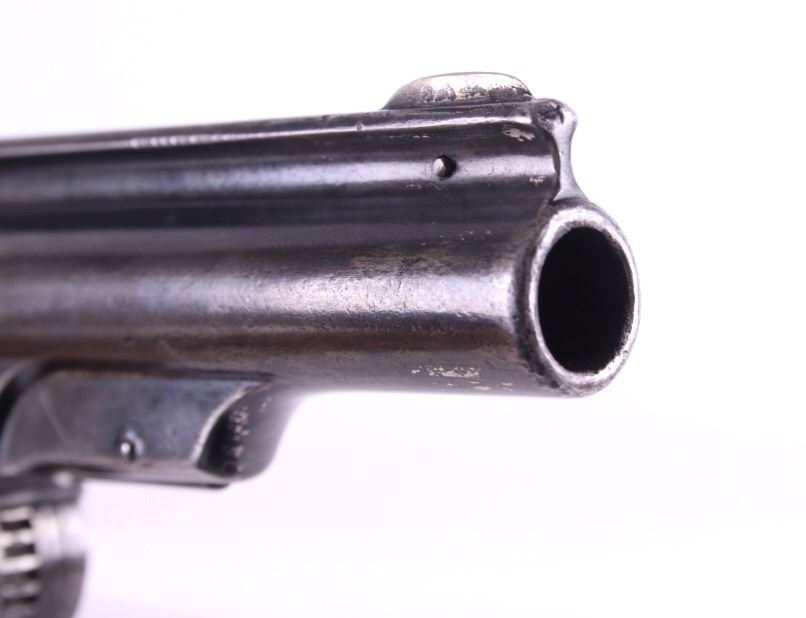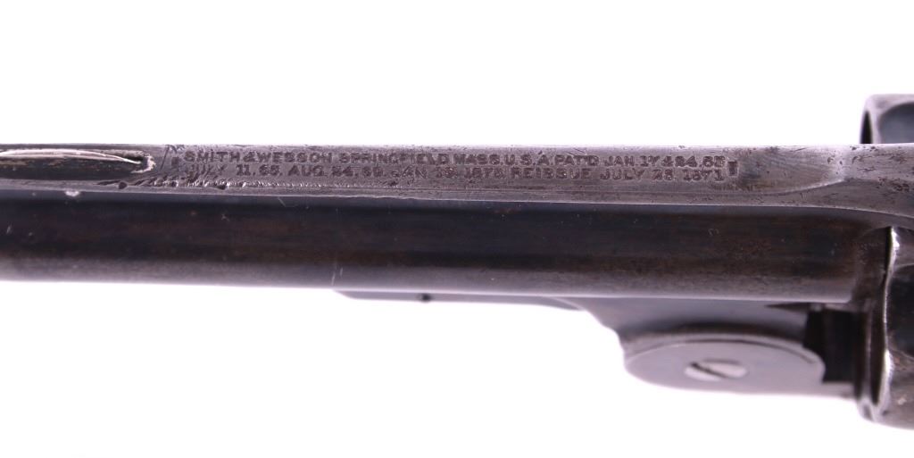 For your bidding pleasure is a Smith & Wesson "Baby Russian" revolver. The Baby Russian as it is nicknamed is the Smith & Wesson 1st Model No. 2 revolver. Chambered in 38 S&W, this five shot single action revolver is in great shape for its age. Pinned blade front and notch rear sights, with the 2 line address/ patent dates reading "Smith & Wesson Springfield Mass USA Pat'd Jan. 17& 24, 65" and "July 11, 65. Aug 24, 69. Jan. 19 1875. Reissue July 25 1871" on top of the rib. Matching numbers are present on the frame, barrel latch and cylinder. The barrel, frame and cylinder show a rich patina in the blu'd finish. Hammer and trigger are checkered, and the grips are checkered with diamond patterns around the screw and "S&W." in circles at the top. This gun is an Antique and an FFL is not required.