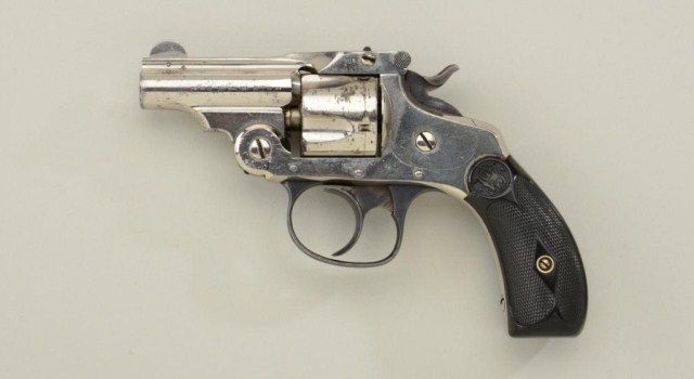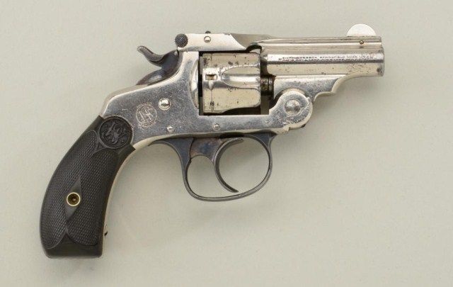 Smith & Wesson “Bicycle Model” DA top break revolver, .32 cal., 2” barrel, nickel finish, checkered black hard rubber grips, #237031. This gun is in overall fine condition showing 92% original finish, fine bore, crispaction, sharp markings, very good grips with a slight old mar at the top of the left grip; hard to find the Bicycle Model in an exposed hammer top break. Formerly in the Dr. John Hall collection, founding member of the S & W Collector’s Assoc. Est.: $300-$600.