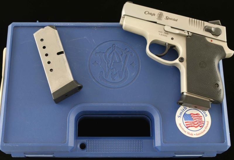 'Chiefs Special' Double action semi-automatic compact pistol chambered in .45 Auto, circa 2001. Features a satin finished stainless steel slide, 3.25" barrel, dovetailed three-dot sights with Novak drift adjustable rear sight, .305" smooth trigger, .260" bobbed hammer, ambidextrous thumb safety/decocker, push button magazine release, factory 6 round magazine with finger rest floorplate, aluminum alloy frame and one-piece pebbled black rubber wrap-around grip with S&W monograms. Includes the original factory hard case with manual, spent case and spare magazine. Pistol exhibits some light slide wear on the barrel with no other wear observed. Action is smooth, bore is excellent and the rubber grip is fine. Condition is near NRA Perfect in case. ***Modern Firearm***