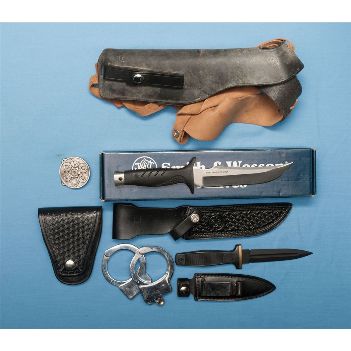 Includes a leather shoulder holster, leather handcuff case with handcuffs (key missing), knife with box and sheath, boot knife in box, and belt buckle in box. All components are genuine S&W except for the handcuffs. CONDITION: Good to very good overall.