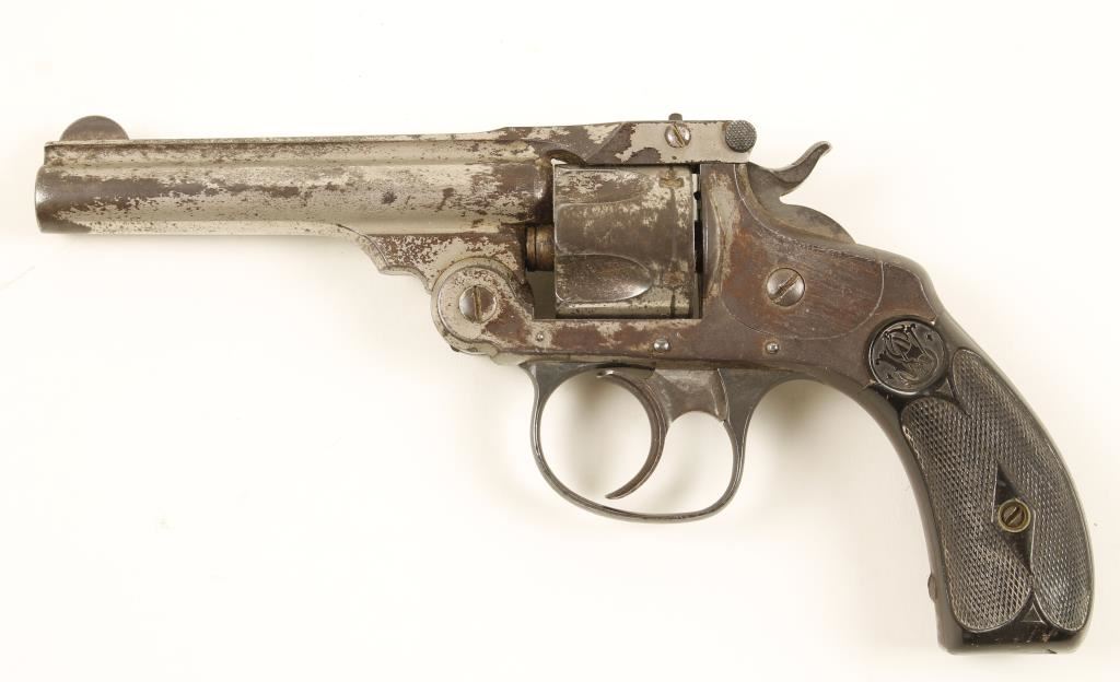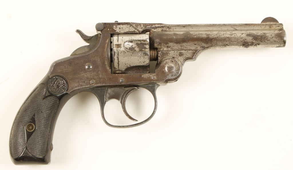 Nickel plated double-action 5-shot top-break revolver with a 3-1/2" barrel. Plating has approx. 25-30% remaining and that is dull. Blued rounded trigger guard is from a later model and has small areas of surface rust and pitting. Bore is dark with pitting and sharp rifling. Chambers all have corrosion. Function is poor in single action and lock-up is poor in either single or double action. Hard rubber grips have scratches, rubs and dings with a crack and tiny chip on the bottom of one. Condition is poor.