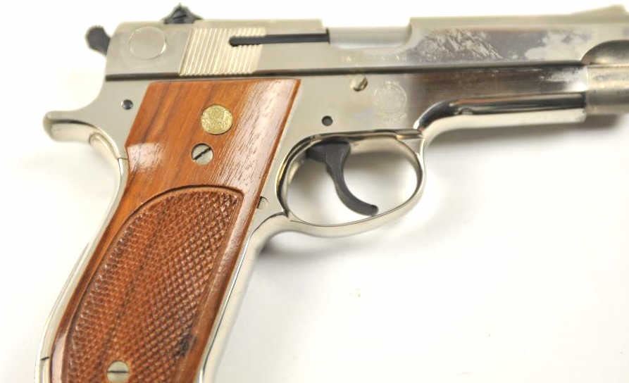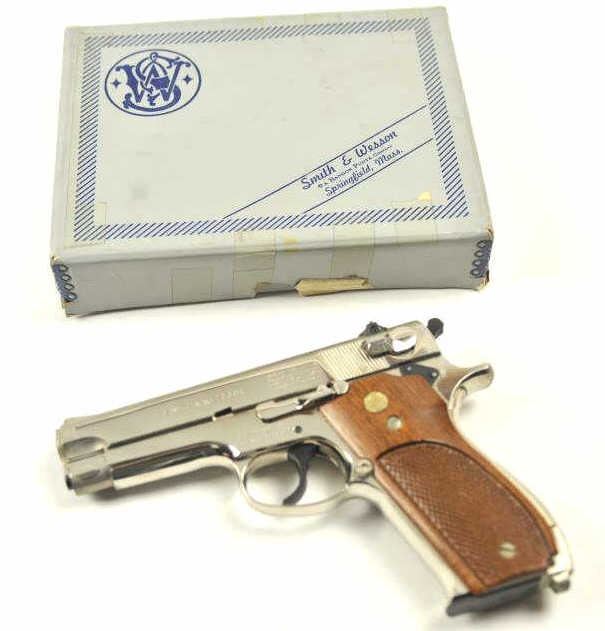 Smith & Wesson DA Model 39-2 semi-automatic pistol, 9mm caliber, Serial #A298214. The pistol is in fine to nearly excellent overall condition with a 4” barrel with an adjustable rear sight. The pistol retainsnearly all of the nickel finish with some areas of frosting evident. The checkered medallion wood grips are in excellent condition with sharp checkering and the lanyard ring is retained. The pistol comeswith the grey and blue cardboard Smith & Wesson factory box with two correct magazines, cleaning rod, all associated packaging materials and matching end label. Est.: $300-$600. (Modern/PPT).
