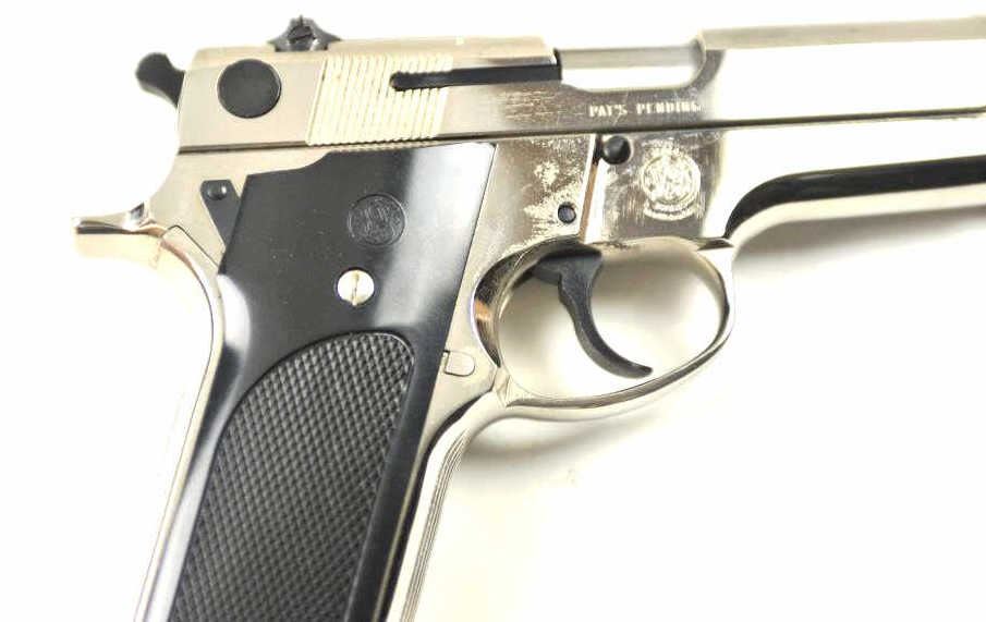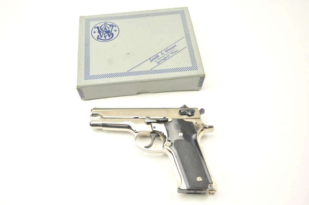 Smith & Wesson DA Model 59 semi-automatic pistol, 9mm caliber, Serial #A368366. The pistol is in fine overall condition with a 4” barrel with an adjustable rear sight. The pistol retains nearly all of the nickelfinish with some areas of light frosting. The checkered plastic grips are in excellent condition with sharp checkering. The pistol comes with the grey and blue factory Smith & Wesson cardboard box with a cleaning rod, all associated packaging materials, two correct magazines and a matching end label. The bore is good, the action is crisp and the markings are sharp. Est.: $400-$800. (Modern/PPT).