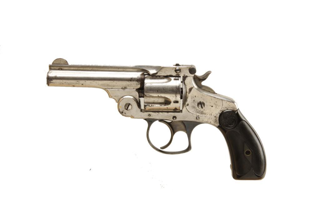 Smith & Wesson DA Top Break Cal .38S&W SN:129969, Nice double action 5 shot revolver. Nickel finish, black checkered hard rubber grips, 3 1/4" barrel with fixed sights, good bore and action. Condition: Good with 90% of finish remaining. Grips both haSN:129969, Nice double action 5 shot revolver. Nickel finish, black checkered hard rubber grips, 3 1/4" barrel with fixed sights, good bore and action. Condition: Good with 90% of finish remaining. Grips both have pieces missing from the butt. Still a good purse gun.