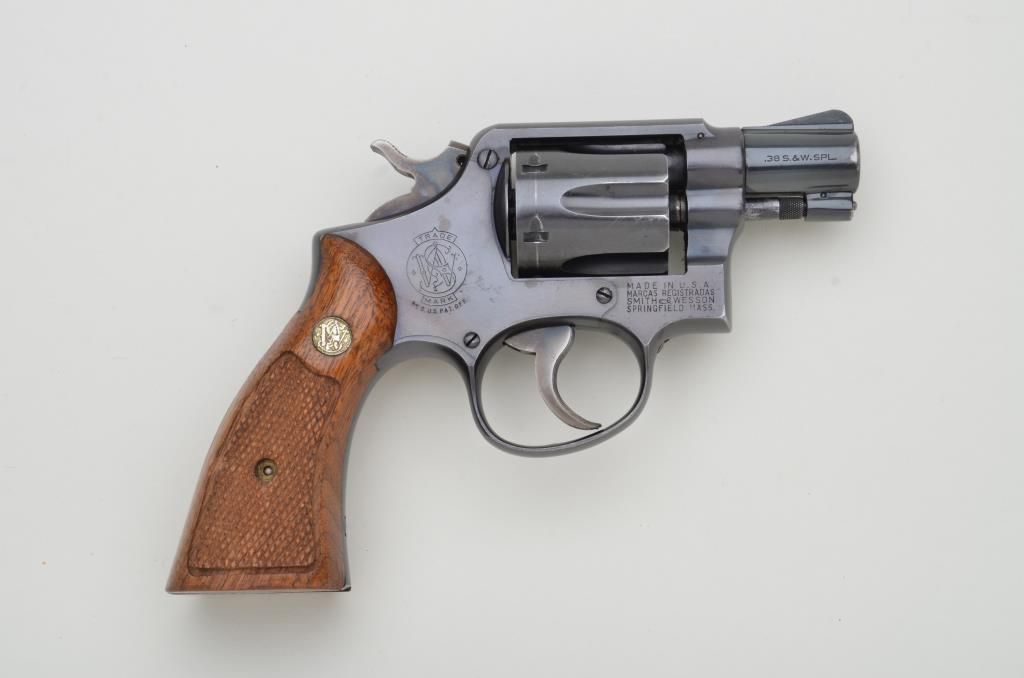 Smith & Wesson DA hand ejector 5 screw pre-Model 10 revolver, .38 S&W Special cal., 2” barrel, blue finish, checkered wood medallion grips, square butt, #C160895 in overall fine condition showing the majority of its original blue finish, slight muzzle wear and a couple minor spots of thinning finish, fine bore, action, markings and grips; vivid case colors on hammer and trigger. Est.: $300-$600.