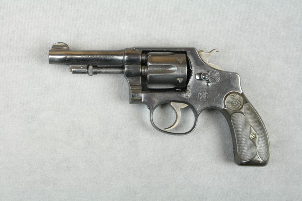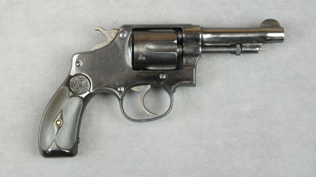 Smith & Wesson DA hand ejector revolver, .32  long cal., 3-1/4” barrel, old re-blued  finish, checkered black hard rubber grips,  #30391. This gun is in overall fair condition  showing the majority of its old re-finish,good action and grips, bore shows a bulge  approx. ½” from the muzzle; five screw frame;  good for parts. Est.:  $100-$200.