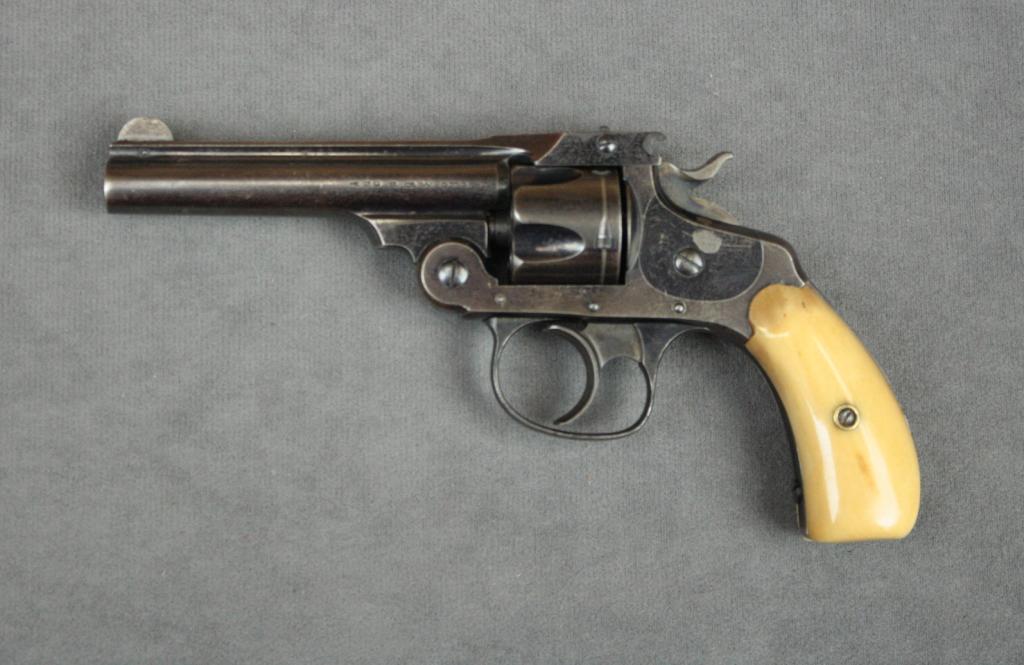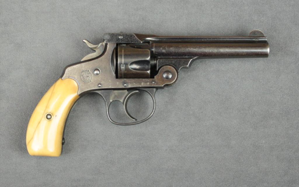 Smith & Wesson DA top break pocket revolver, .32 cal., 3-1/2” barrel, blue finish, bone grips, #257738. This gun is in overall fine condition showing approx. 45% original blue finish, fine bore, action and markings, verygood old bone grips showing an old crack that has been repaired on the back of the right grip. Est.: $250-$500.