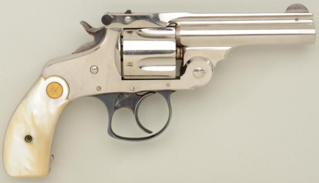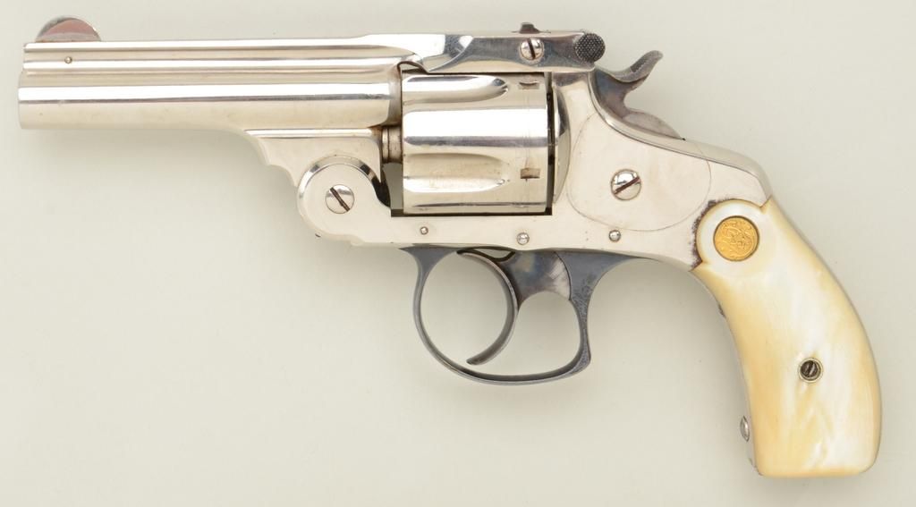 Smith & Wesson DA top break revolver, .38 cal., 3-1/4” barrel, nickel finish, factory pearl medallion grips, #180037. This gun is in overall fine condition showing approx. 98% nickel finish with very good bore, crispaction, sharp markings and very good to fine medallion pearl grips; interestingly, there are two holes drilled into the butt strap, possibly for display, with the matching serial number not on the butt but stamped onthe grip strap underneath the grips; should be factory lettered; accompanied from the estate with a wood base showing two holes that likely serve to house support screws to display this gun. From the Dr. John HallCollection. Est.: $350-$700.
