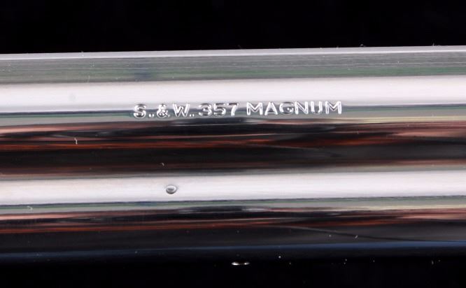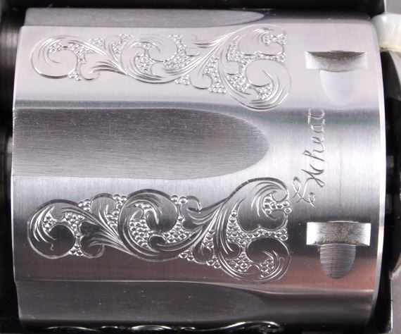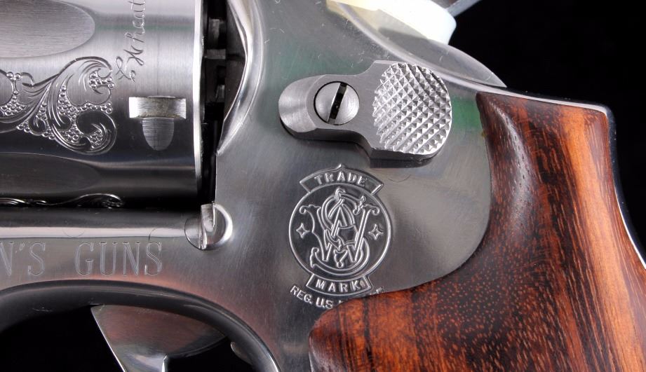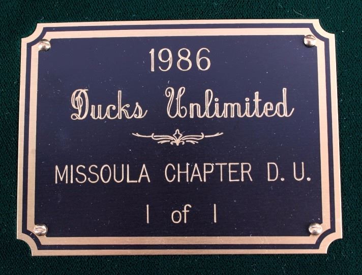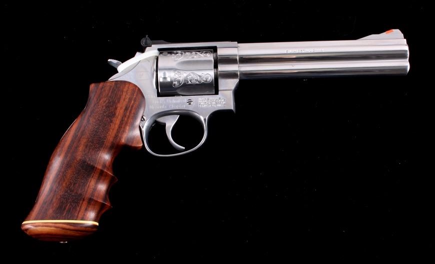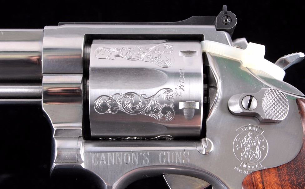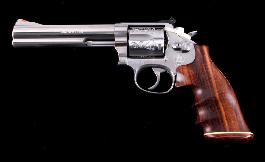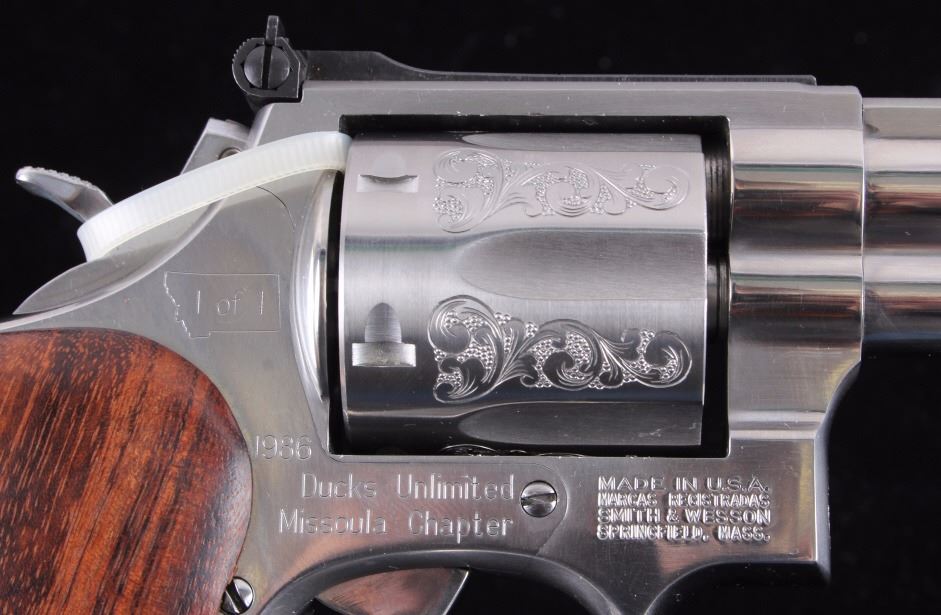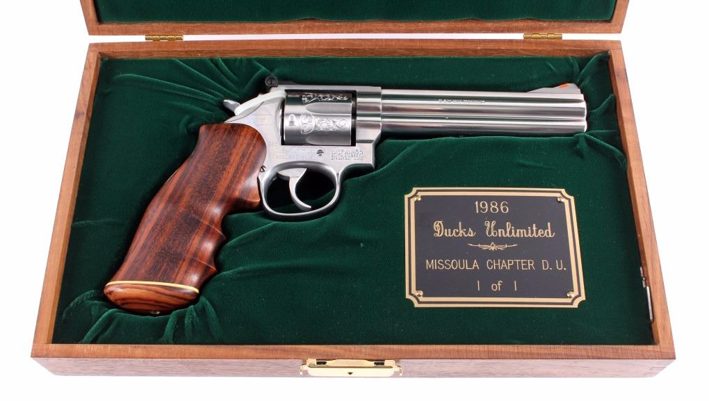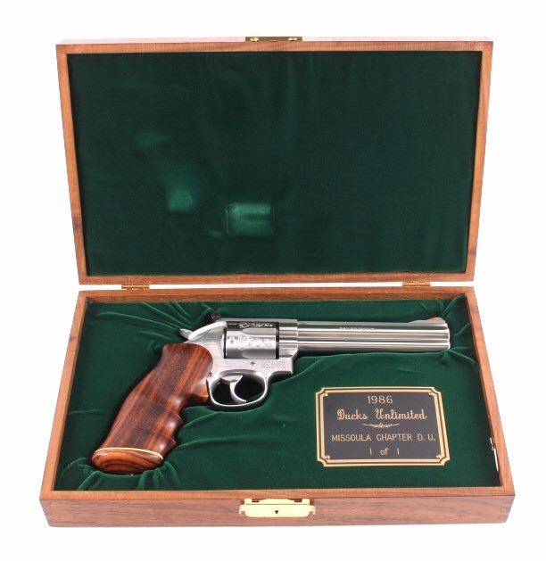 This is a Smith & Wesson Model 686 double action revolver chambered in the .357 Magnum caliber. This is a Ducks Unlimited presentation revolver from the Missoula, Montana chapter. The revolver features a bright stainless finish with custom grips and engraving. The pistol has an upgraded action and accuracy by renowned gunsmith Andy Cannon of Victor, Montana. The frame is engraved "Cannon's Guns" to reflect his modifications. The custom rosewood contoured grips were made by Hogue of California. Lastly, the cylinder has been extensively engraved by Charles Wheat of Hamilton, Montana. In all, the upgrades and embellishments are valued at over $1400. The revolver comes with a custom solid oak presentation case with a plaque that reads "1986 Ducks Unlimited Missoula Chapter D.U. 1 of 1". The original Smith & Wesson factory box is also included. The revolver is in excellent, new pristine condition and has never been fired outside the factory. A truly unique and one of a kind presentation revolver. The pistol measures 11.5" long overall with a 6" barrel. Serial number is AUU0224. This is a modern manufactured handgun and requires an FFL or NICS background check to transfer.