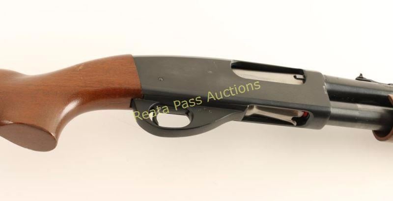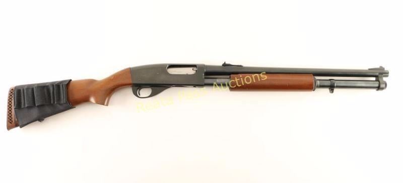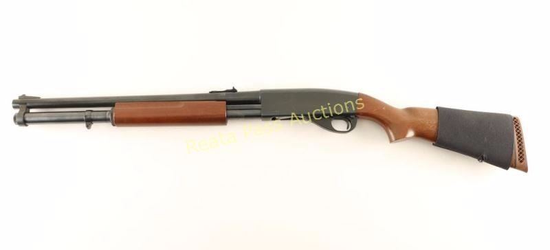 SN: 8B2850JFC 'Riot Gun' American made slide-action repeating shotgun chambered for 3" 12 gauge shells. Features a blued finish, 20" barrel, ramped patridge front sight, adjustable rear window sight, full-length tube magazine, sliding tang safety, swivel studs, rounded trigger, smooth wood side handle and pistol grip shoulder stock with slip up shell holder & factory recoil pad. The triggerguard & barrel are stamped "JFC" like the last three characters of the serial number, these may have been added and possibly are an acronym for a sheriffs department or other law enforcement agency. Shotgun exhibits approximately 90% of it's blued finish showing heavy slide wear on the magazine tube and moderate handling marks on the receiver. Action is smooth, bore is excellent and wood stocks are good to very good with moderate blemishes. Condition is very good. ***Modern Firearm***