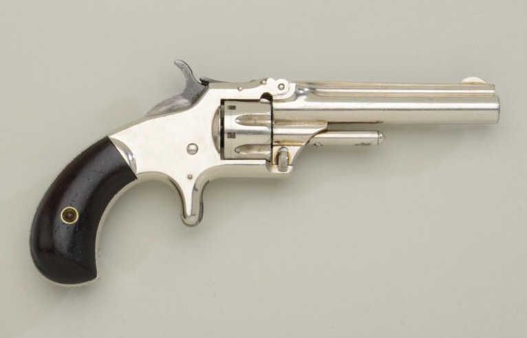 Smith & Wesson First Model 3rd Issue .22 cal. 7-shot revolver, nickel plated, rosewood grips, #92177. The revolver remains in very good condition with 85-95% original nickel, some small losses and light erosion andpinpricked pitting where the nickel has lifted; the edges are good, markings are good, grips are very good with even wear, action tight, bore very good. Est.: $250-$500