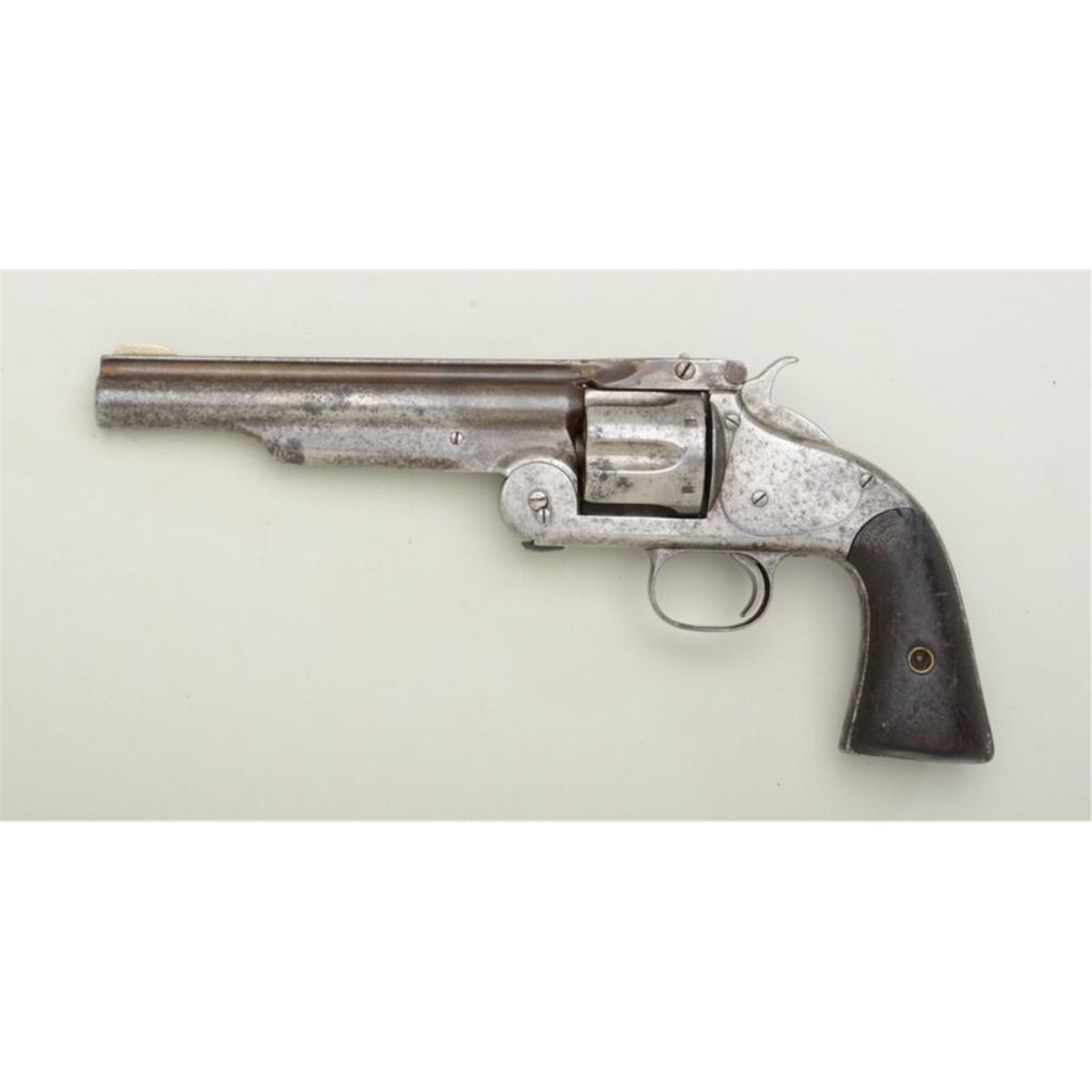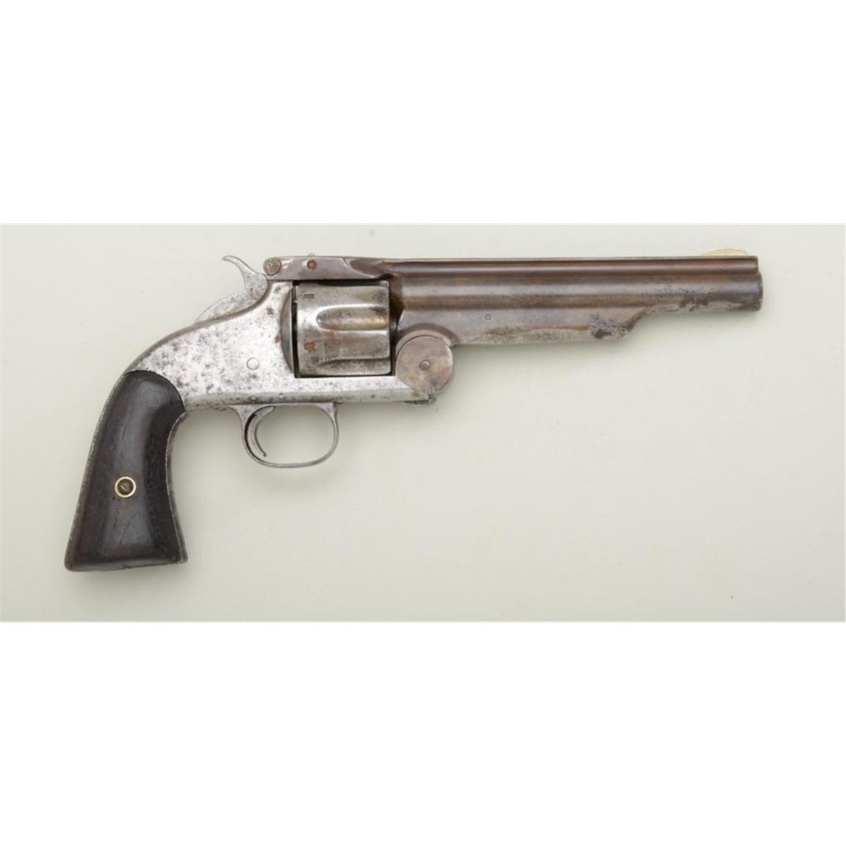 Smith & Wesson First Model American top break revolver, .44 cal., 6” barrel, wood grips, #1809. This classic old gun shows heavy use, possibly south of the border with scattered erosion and light pitting, an old repair tothe top rib of the barrel at the breech, number has been re-stamped on the butt and the lanyard ring hole has been repaired; the bore is dark, action is fair at time of description but weak, barrel address iscentered on the rib and appears original 6” length (standard was 8”); grips are worn but overall good; correct early squared trigger and hammer without notch. Est.: $600-$1,200.