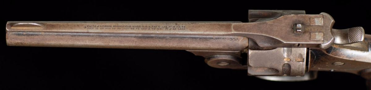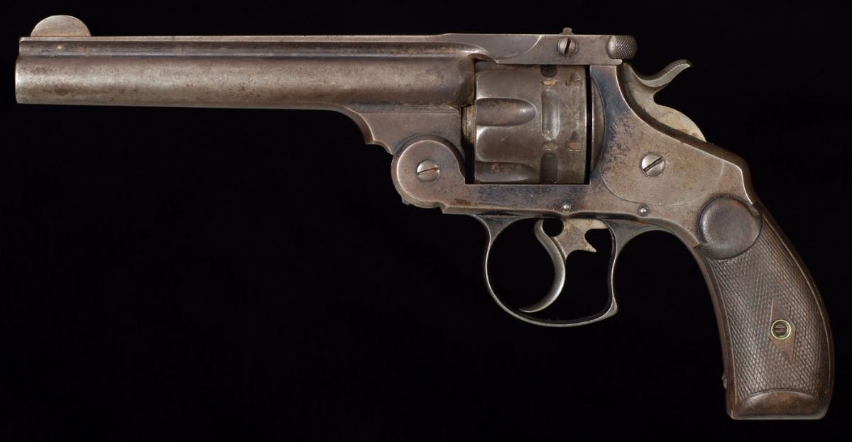 S/N 12492, .44 S&W Russian, 6" round ribbed barrel Smith & Wesson 1st Model double action revolver. Blued, two-piece checked walnut grips, all match including grips, correct two-line S&W barrel address, circa 1890s. CONDITION: very good bore with scattered black powder oxidation, 20% barrel blue, 10% frame, 10% cylinder, touches of case color on hammer and trigger, grips are worn but in excellent condition, excellent markings, mechanically excellent.
