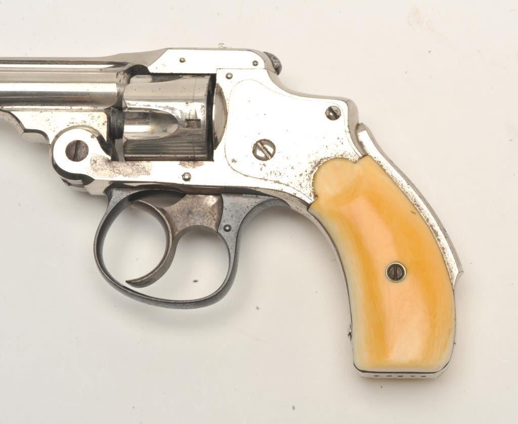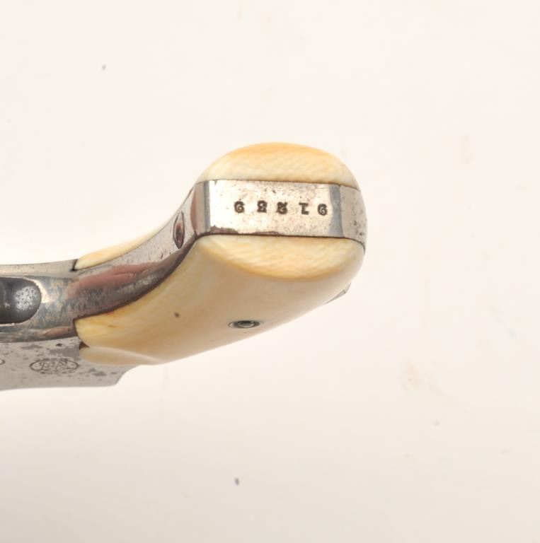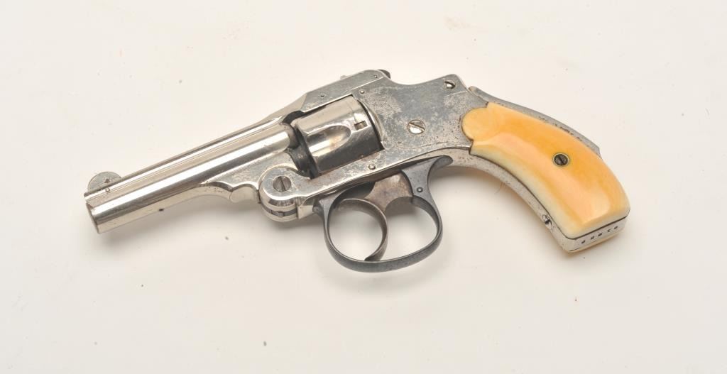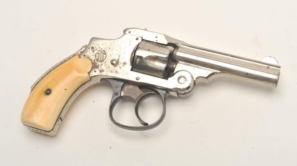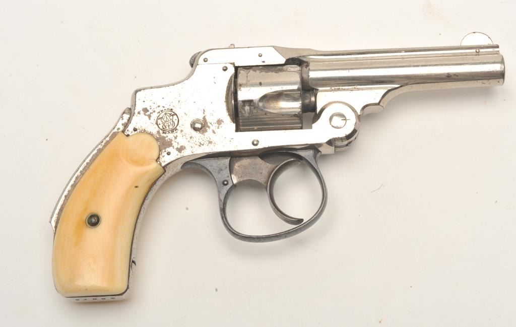 Smith & Wesson First Model Safety Hammerless DA revolver, .32 caliber, 3” barrel, nickel finish, ivory grips, S/N 91239 ( cylinder and barrel assembly #77258), in overall very good condition showing the majority of itsoriginal finish with some old flaking, crisp action, very good markings, fair bore and beautiful ivory grips. (Antique). Est.: $200-$400.