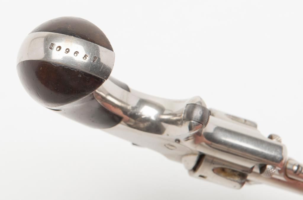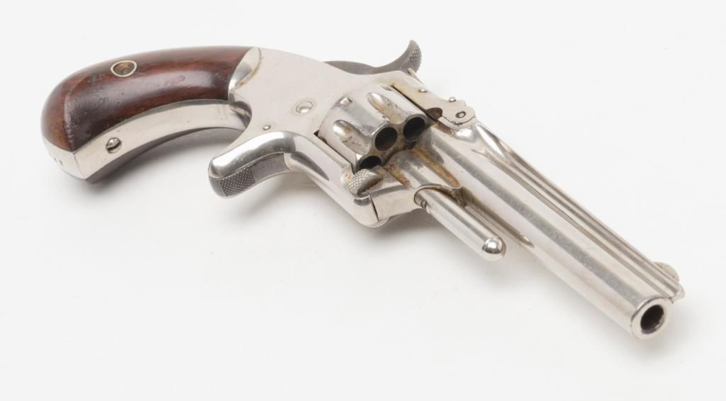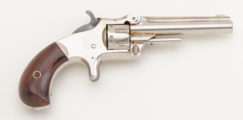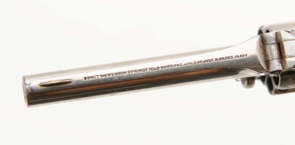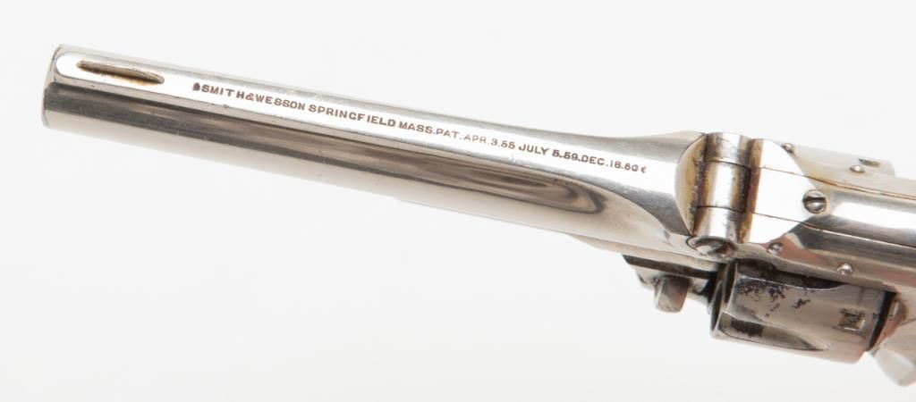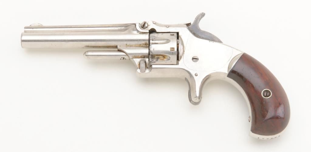 Smith & Wesson First Model, Third Issue spur trigger revolver, .22 cal., 3-1/4” barrel, nickel finish, rosewood grips, #109651 in overall fine condition showing approx. 96% original finish, crisp action, sharp markings, fine grips, goodbore, considerable original case hardening on hammer. (Antique). Est.: $375-$750.