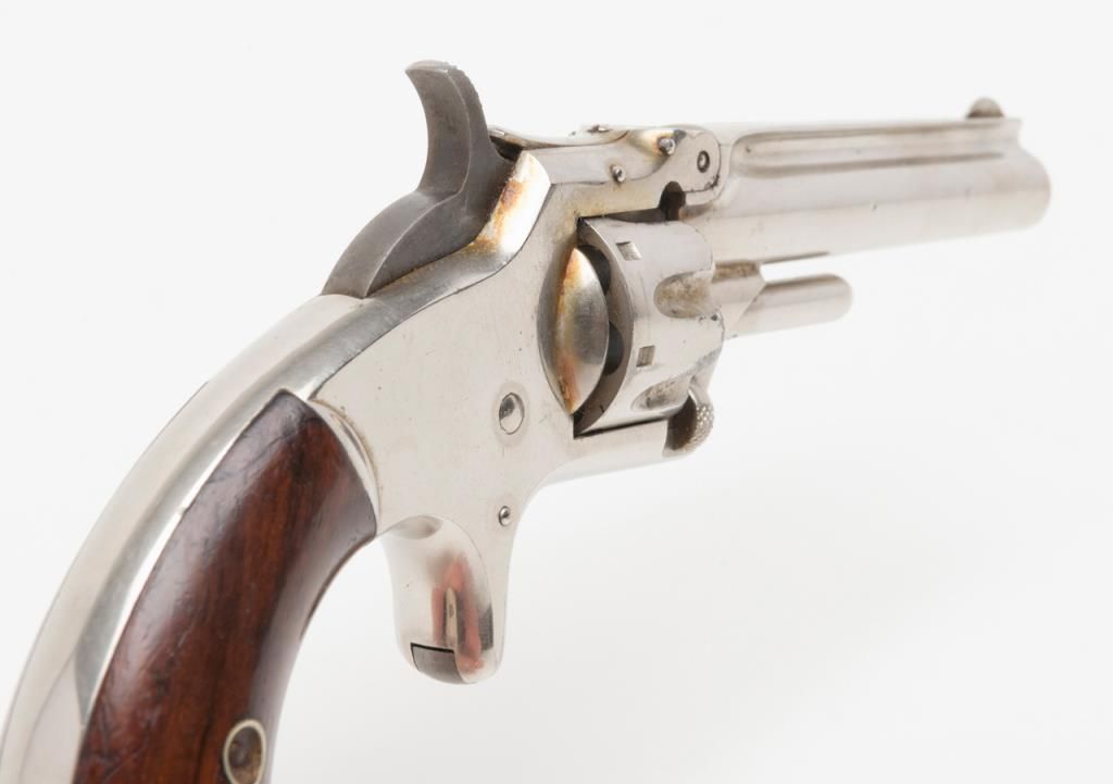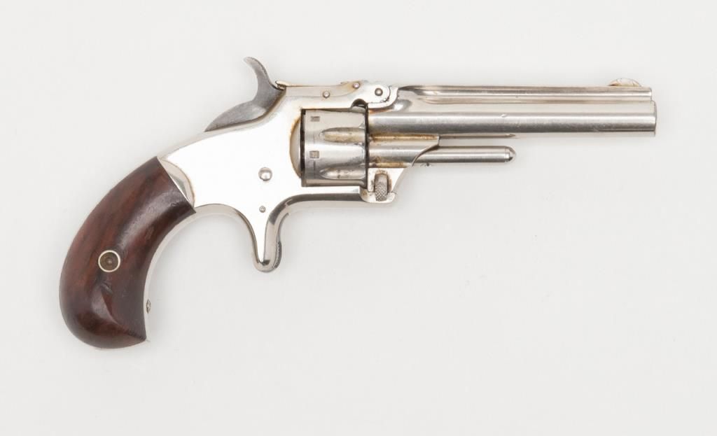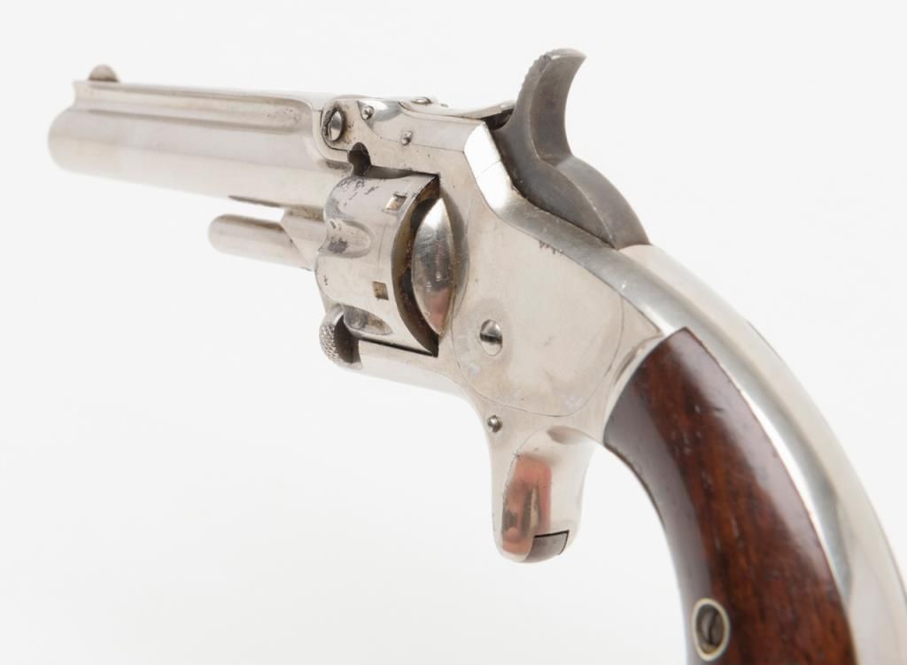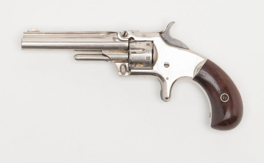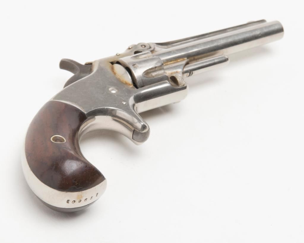 Smith & Wesson First Model, Third Issue spur trigger revolver, .22 cal., 3-1/4” barrel, nickel finish, rosewood grips, #109651 in overall fine condition showing approx. 96% original finish, crisp action, sharp markings, fine grips, goodbore, considerable original case hardening on hammer. (Antique). Est.: $375-$750.