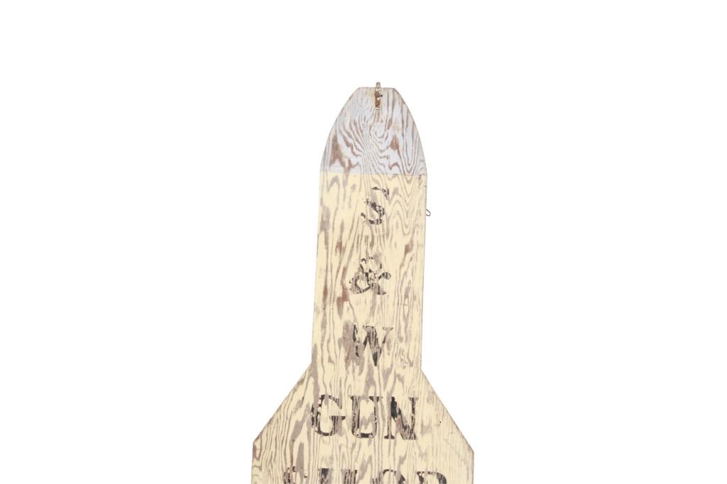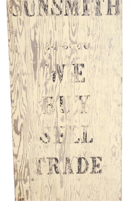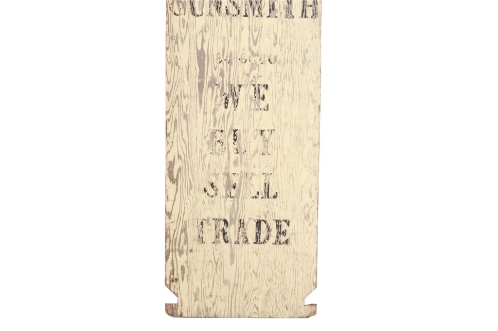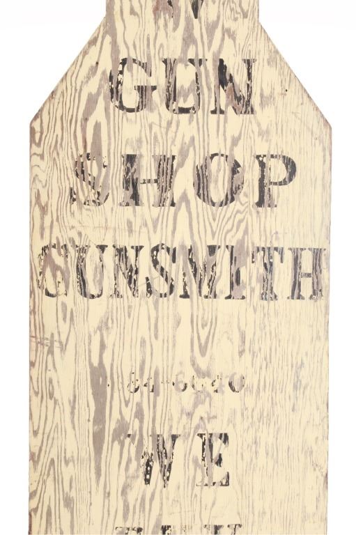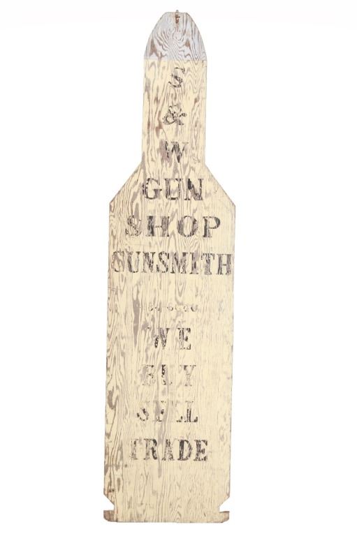 Featured in this lot is a Smith and Wesson Gunsmith advertisement sign, circa 1940s. The advertisement sign has a wonderfully and professionally crafted wooden construction. The sign is double-sided and is made in a cutout of a very large human shooting target. The sign is painted plywood and would have sat outside the shop to entice and advertise the procurement and sale of firearms and their repair. The sign reads on both sides as follows: S & W - Gun Shop Gunsmith - 384-6640 - We Buy Sell Trade. The condition of this wooden gunsmith advertisement sign is preserved with some wear to the black lettering and to the white paint background of the sign with some wear to the wood with oxidation to the adornment on the top. The measurements of this advertisement sign are 96 1/2" x 23 3/4".*
