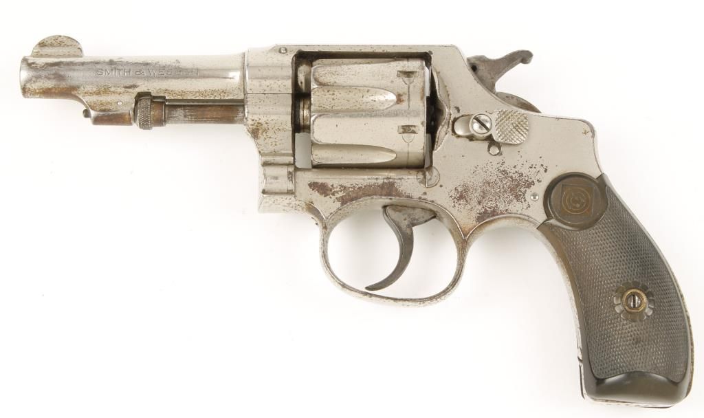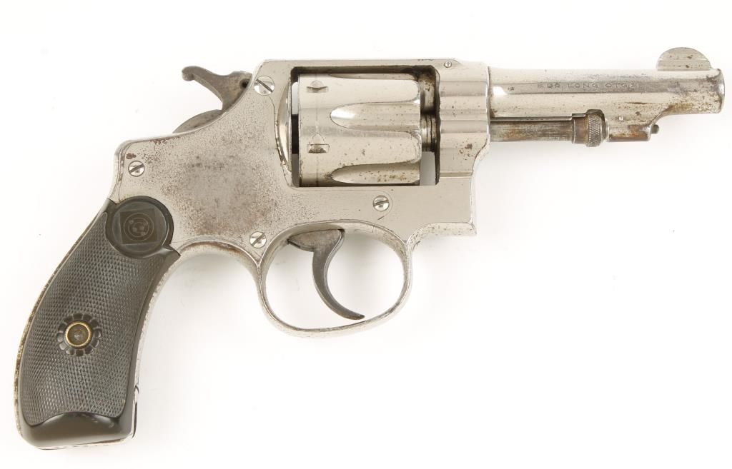 SN:272672, Early model double action 6 shot revolver with 3-1/4" barrel. Nickel finish, checkered plastic grips from an H&R revolver. Good bore and fair action. Condition: Fair showing ding in side plate and timing slightly off. Finish is starting to orange peel and shows 70% finish remaining.