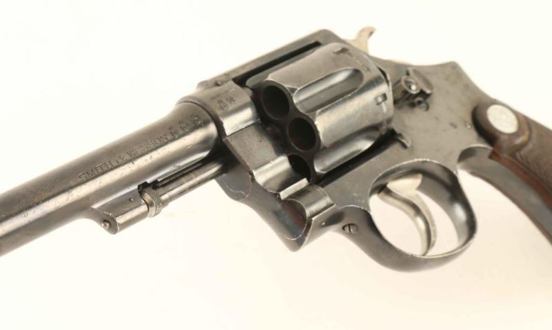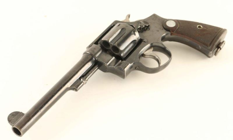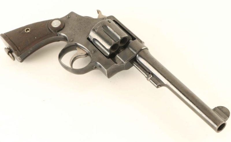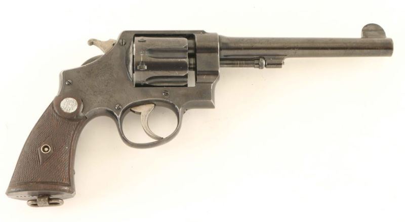 'Second Model' British military large frame double action service revolver chambered for the .455 Mark II cartridge. Produced in America by Smith & Wesson circa 1915-1917. Features a blued finish, 6 1/2" pinned barrel, non-shrouded ejector rod, forged round blade front sight, 'u' notched rear sight, fluted six-shot cylinder measuring 1.587" in length, smooth .265" trigger, .265" hammer with knurled spur, 5 screw square butt N frame and two-piece diamond checkered walnut grips with silver S&W medallions. Serial numbers on the frame, barrel & cylinder are all matching but the right grip panel bears the number 182905. Marked with standard Smith & Wesson stamps, military proofs, Birmingham proofs and a small "NOT ENGLISH MADE" stamp. Revolver exhibits approximately 80% of it's original polished blued finish showing scattered wear. The action is smooth with very good lock-up, bore shows light pin prick pitting throughout but retains good luster, markings are crisp and the wood grips are fair. Condition is NRA Good to Very Good. ***C&R Firearm*** From The John F Sukey Collection