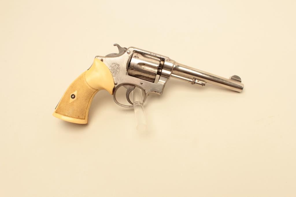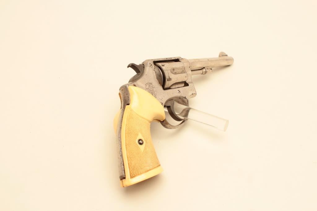 5” barrel, nickel finish, checkered faux ivory plastic grips, S/N 48697, in overall good to very good condition displaying the majority of its factory nickel finish, good bore, action, markings and older replacement grips. (C&R/PPT). Est.: $200-$400.